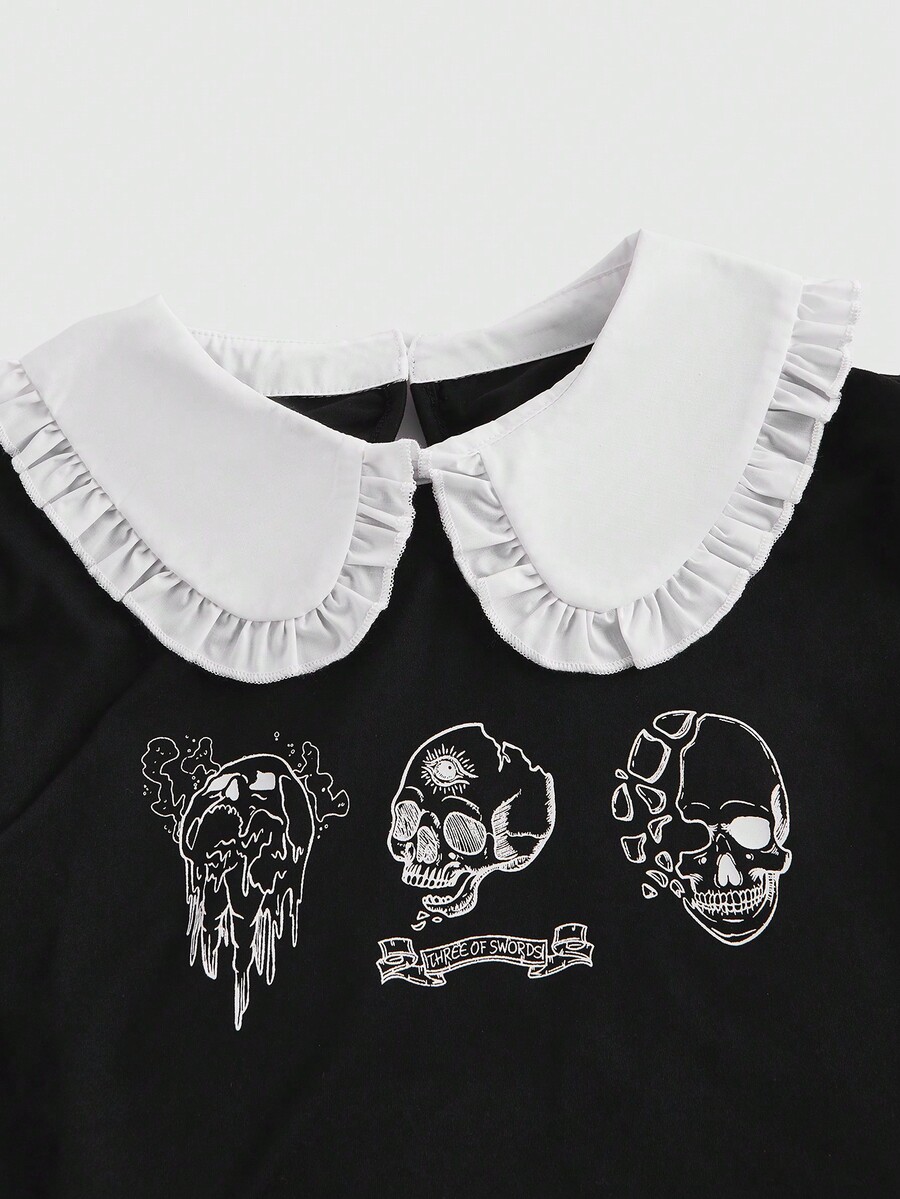 Goth Women's Colorblocking Peter Pan Collar T-shirt With Skull Print