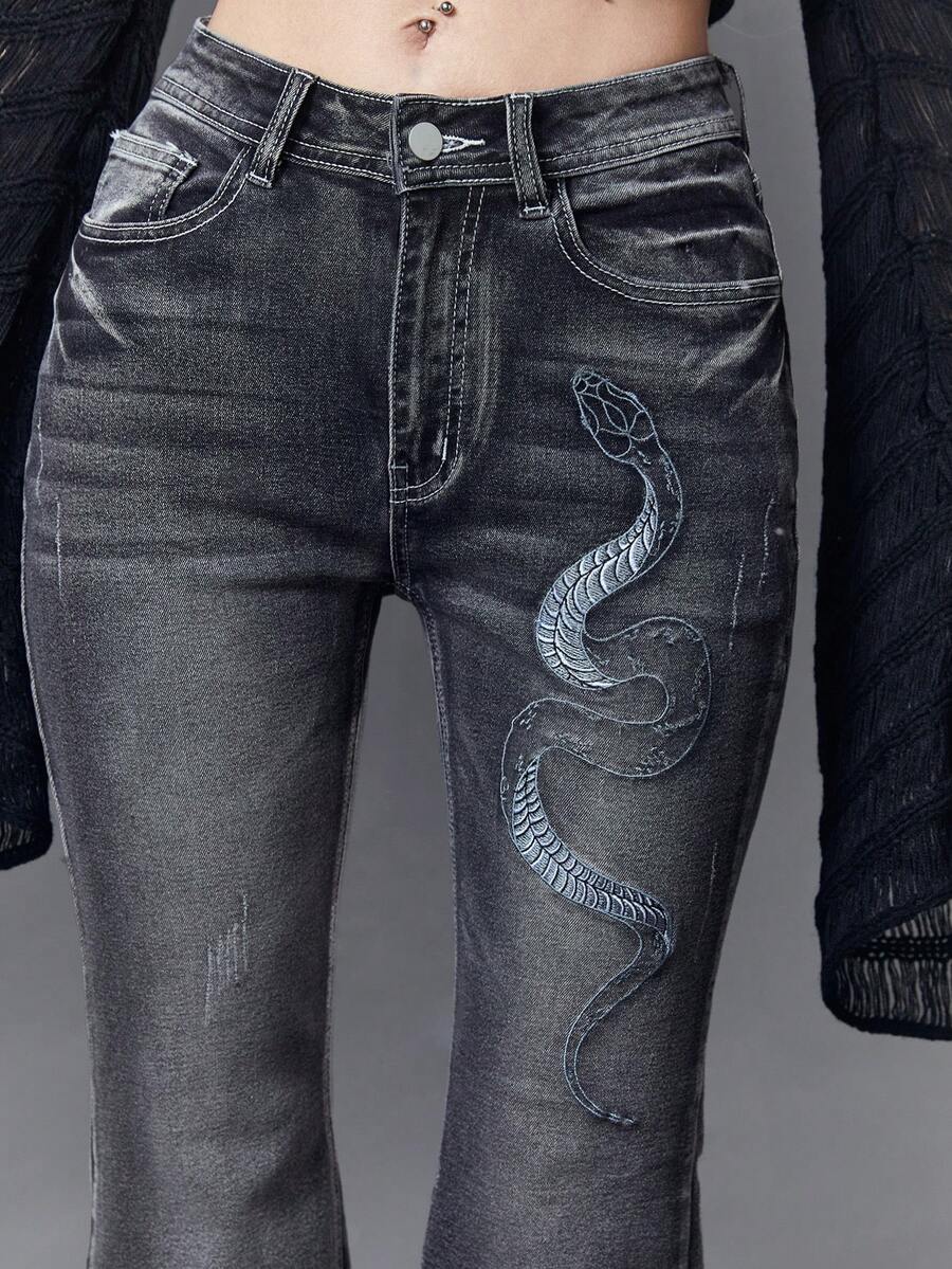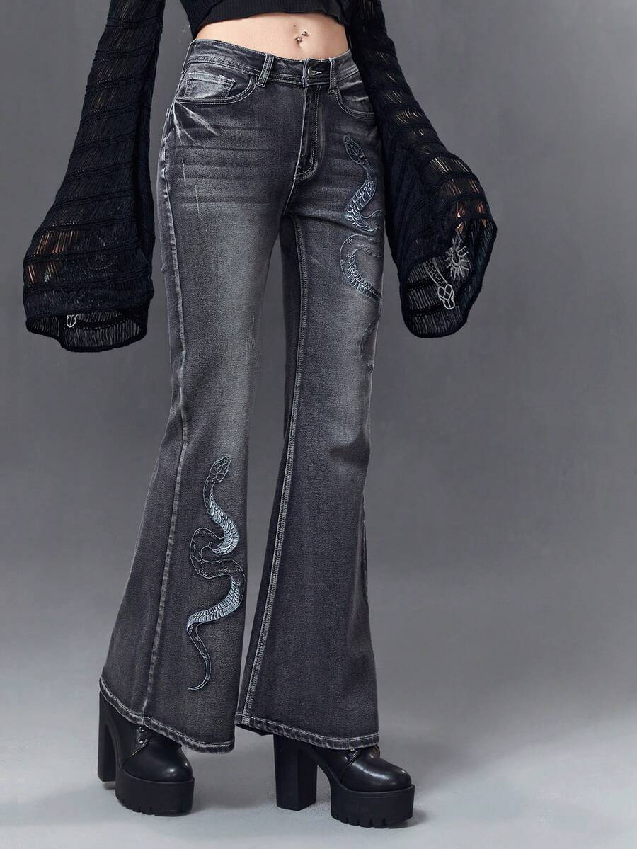 Goth Women's Flared Jeans With Snake Embroidery Design