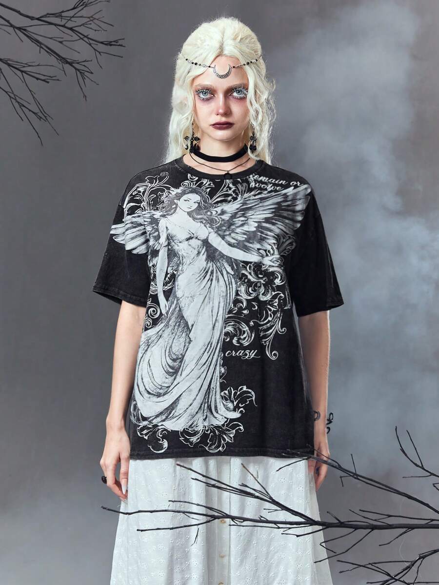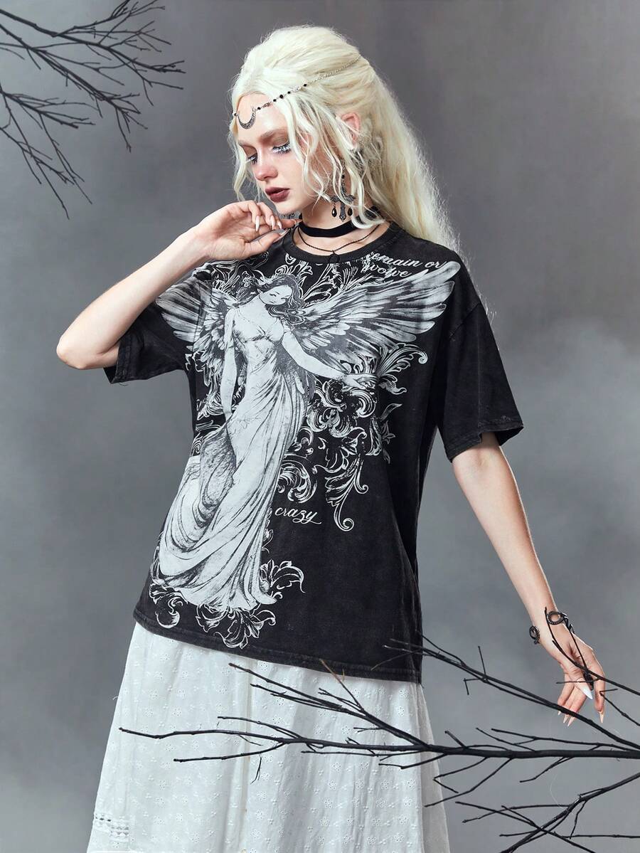 Goth Women's Portrait & Letter Print Round Neck T-shirt