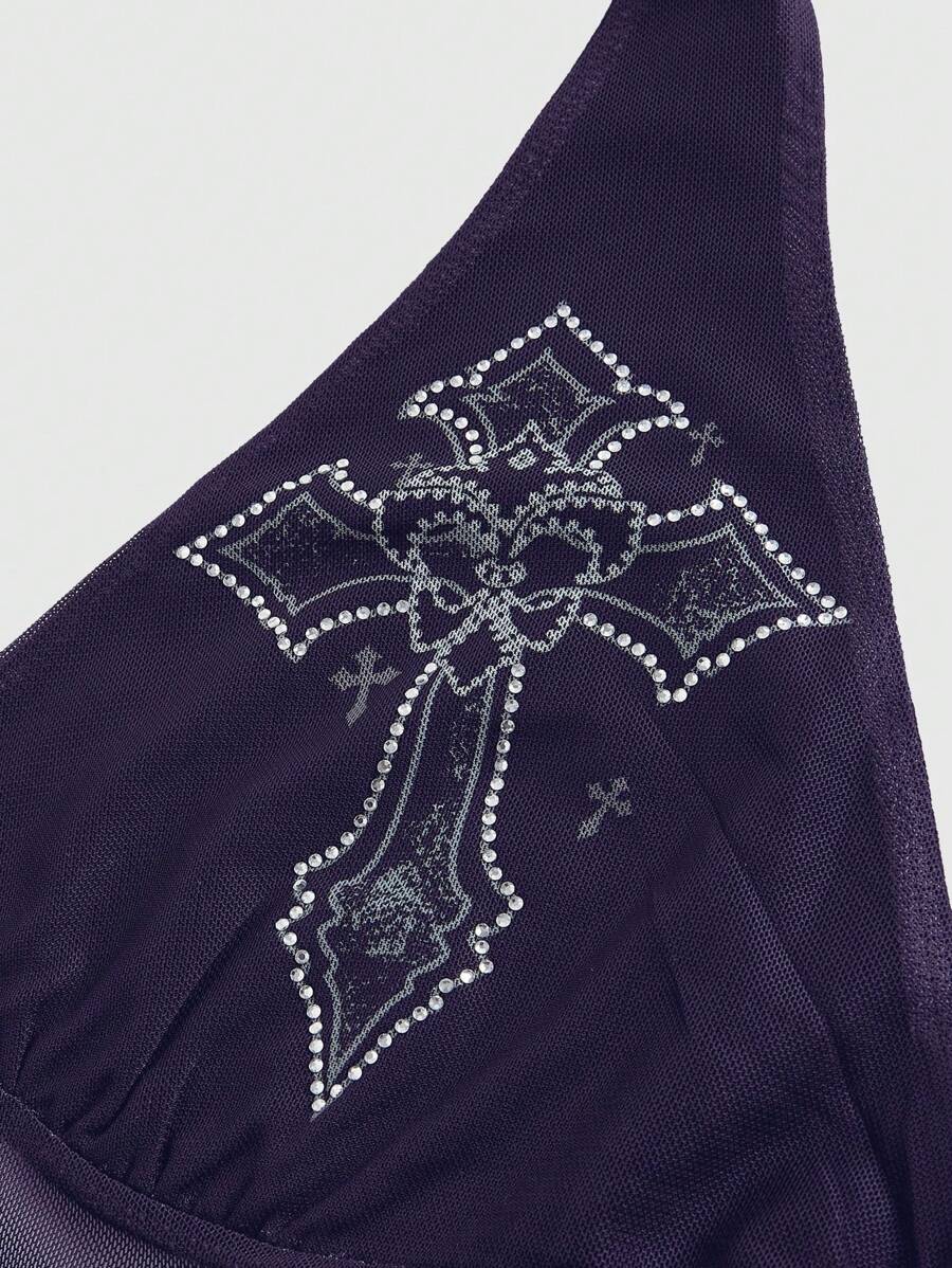 Goth Women's Rhinestone Cross Mesh Side Slit Pleated Halter Neck Tank Top