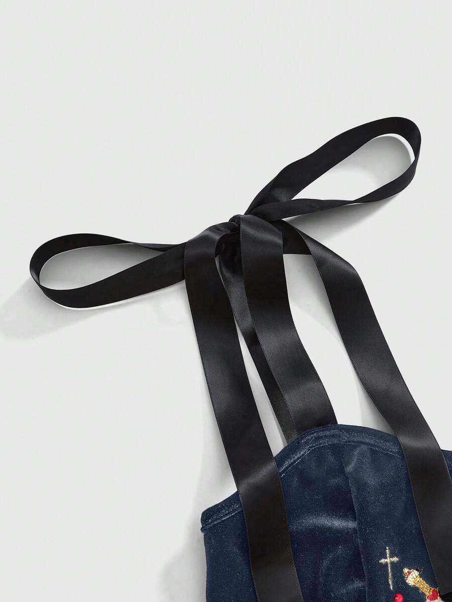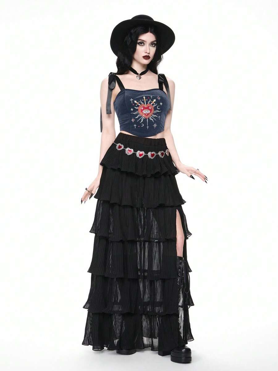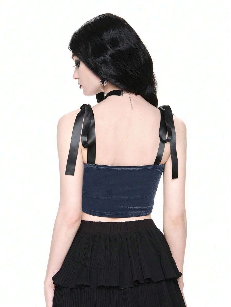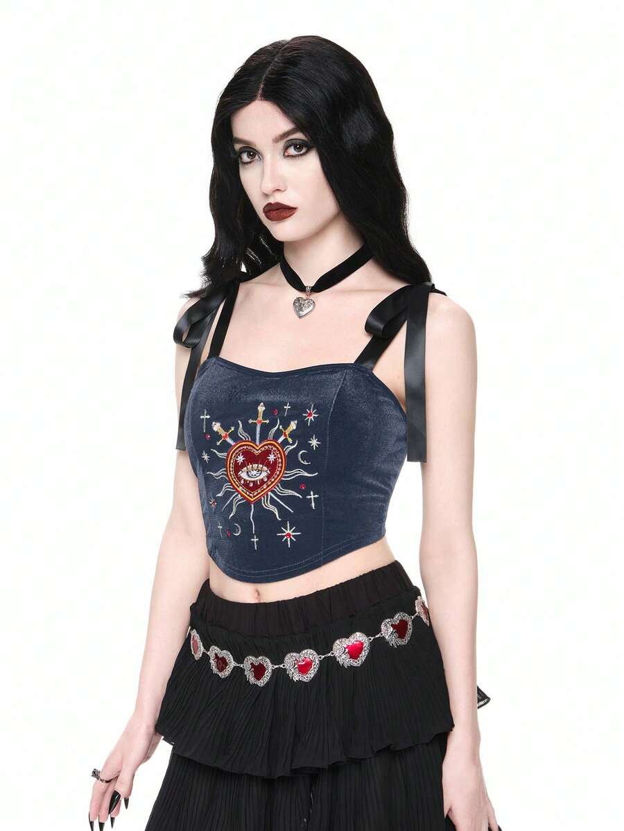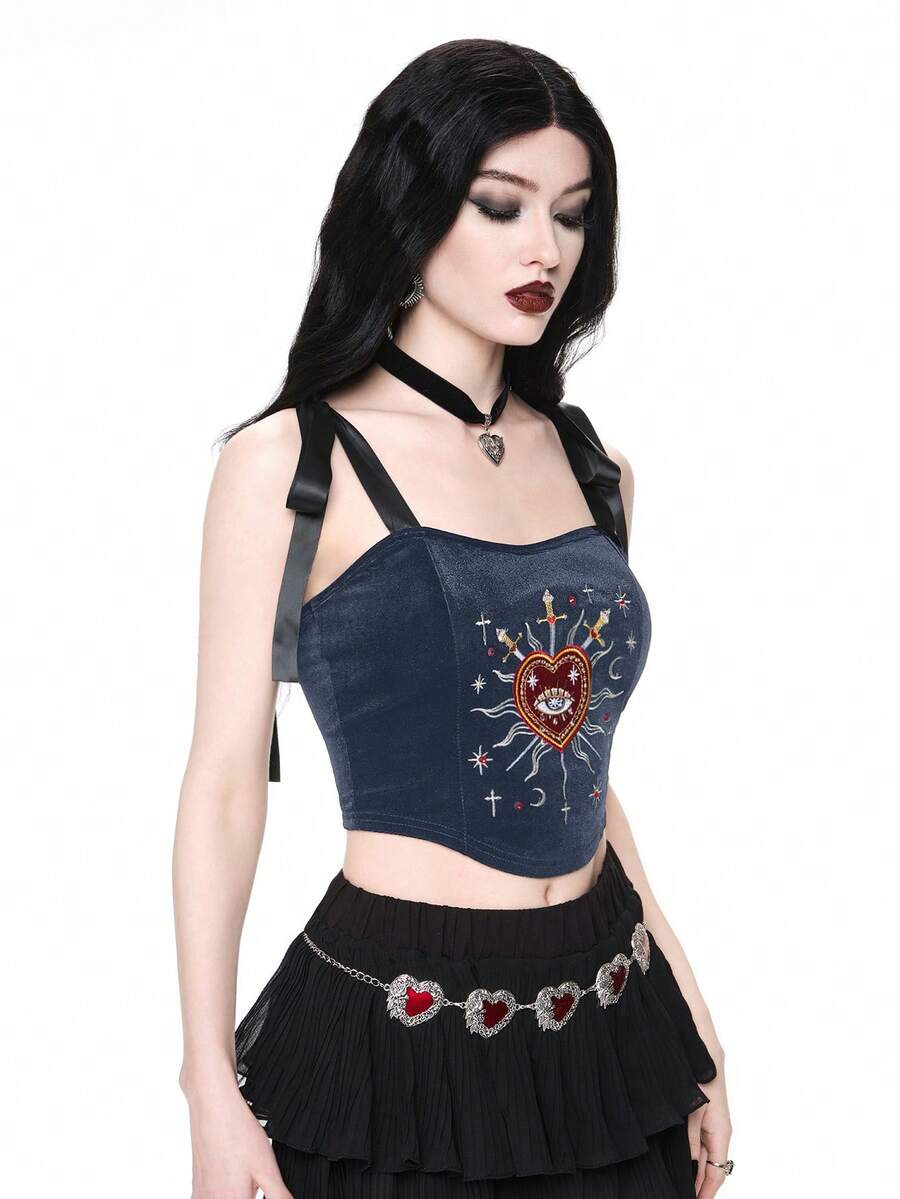 Gothic Princess Aesthetic Heart Embroidery Rhinestone Water Drop Teardrop Star Collar Lace-Up Cropped Tank Top For Women