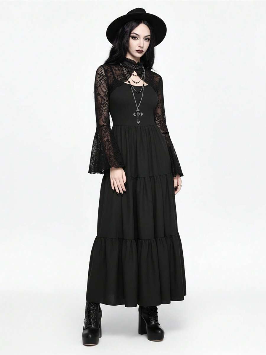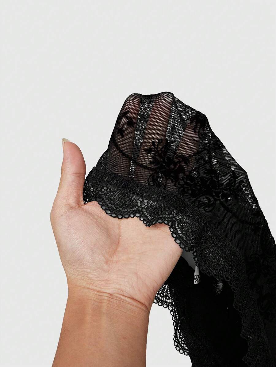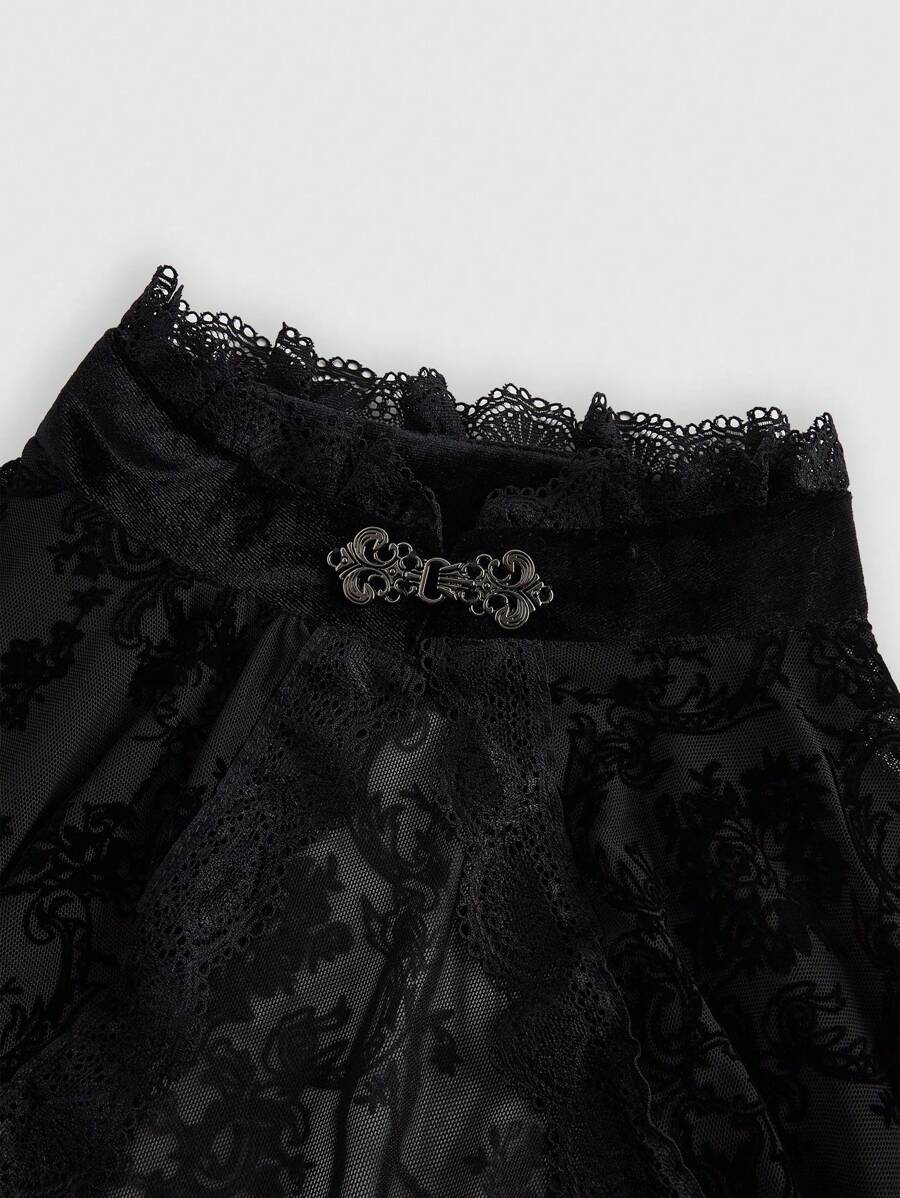 Gothic Versatile Slit Bell Sleeve Women Retro Flocked Black Lace Top