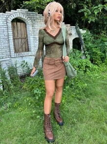 Grunge Floral Print Split Sleeve Lettuce Trim Lace Top Without Bra