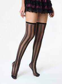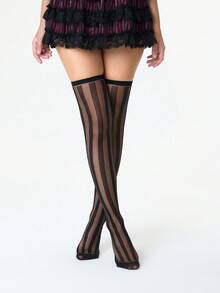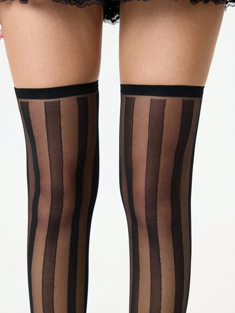 Grunge Punk 1 Pair Punk Style Vertical Striped Thigh High Socks, Y2K Black Solid Color Lace Knee High Socks, Thin Elastic Sheer Tights For Daily Wear