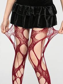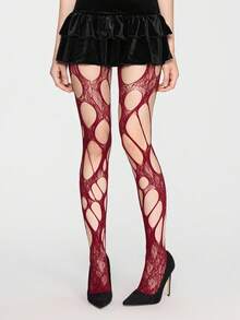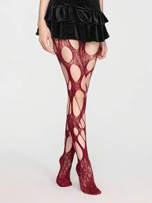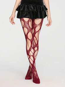 Grunge Punk 1 Pair Sexy Fishnet Stockings With Asymmetrical Hollow-Out Design, Stretchy And Sheer Burgundy Jacquard Suspender Tights