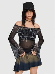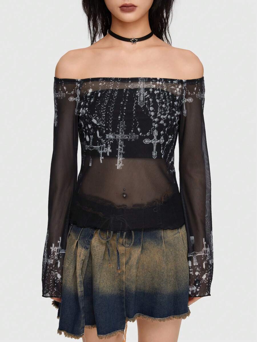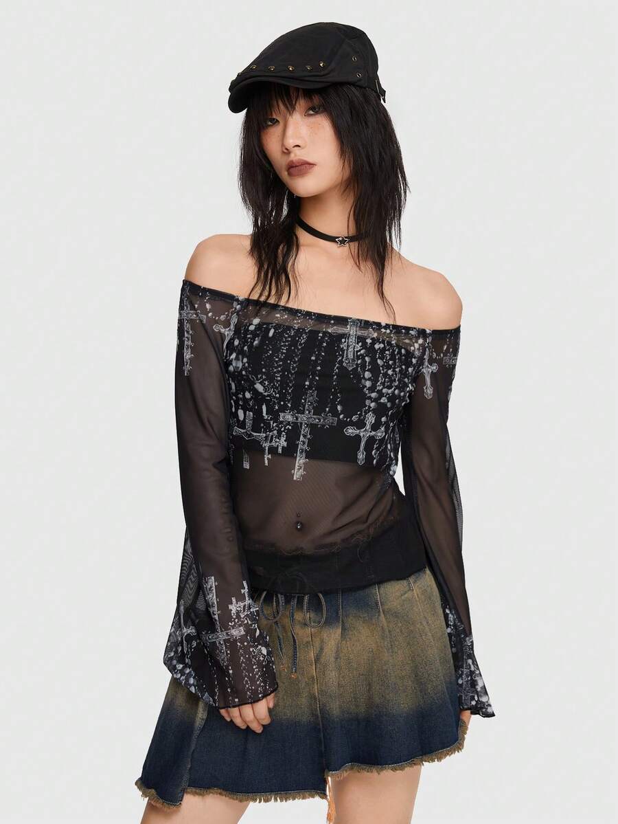 Grunge Punk Cross Print Off Shoulder Mesh Top