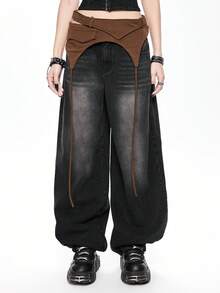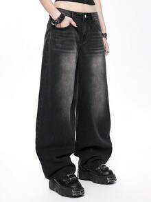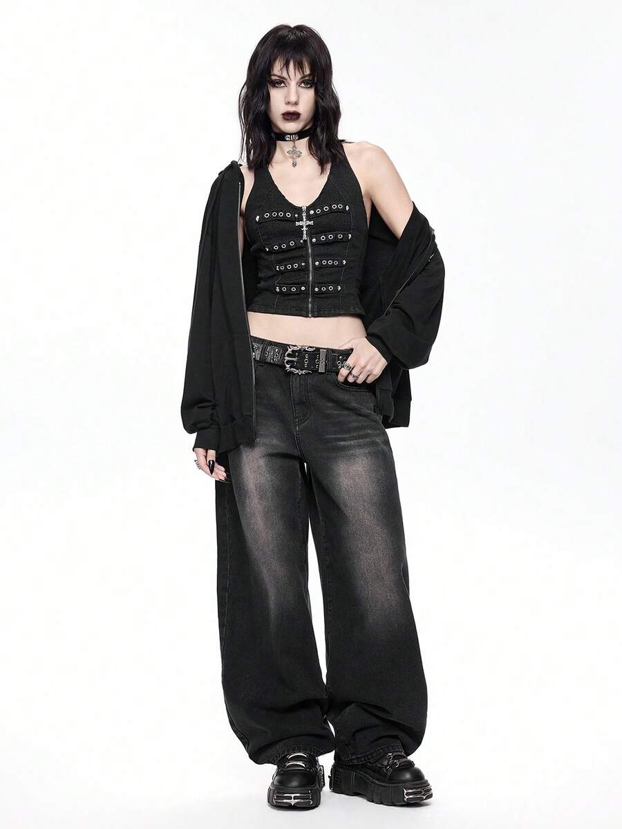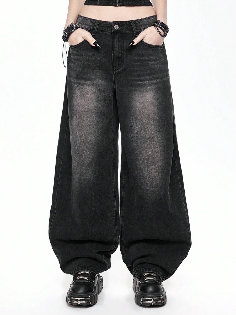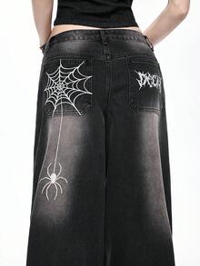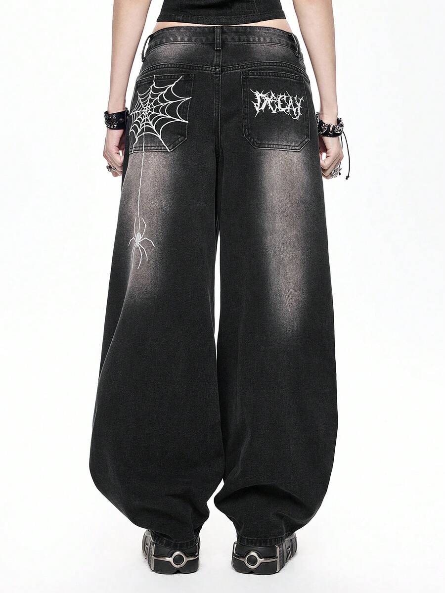 Grunge Punk Distressed Spiderweb Embroidered Oversized Flare Women Jeans