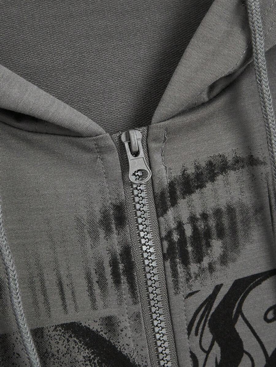 Grunge Punk Eye & Skull Graphic Zip Up Drawstring Hoodie
