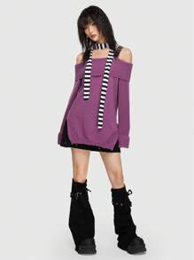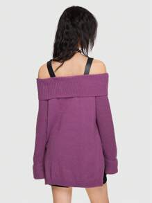 Grunge Punk Foldover Cold Shoulder Split Hem Sweater