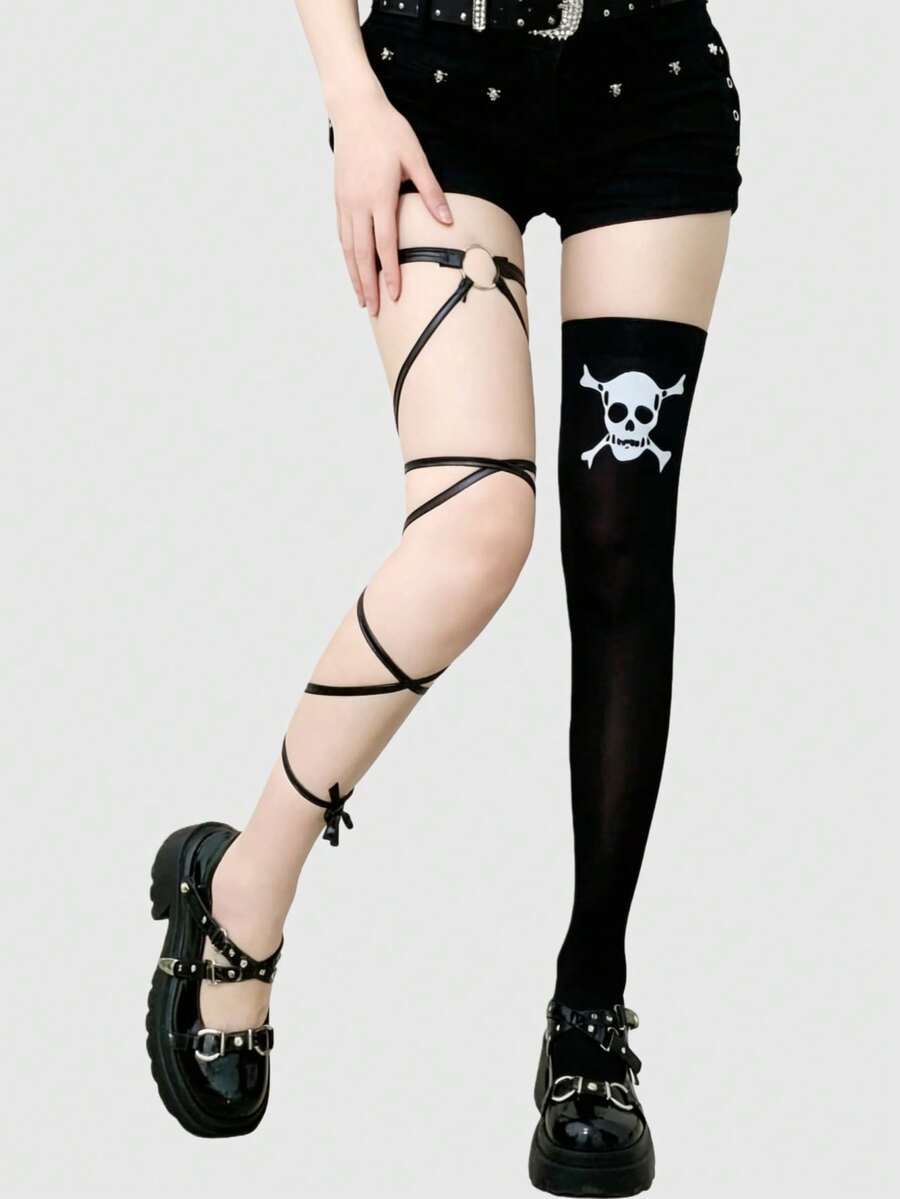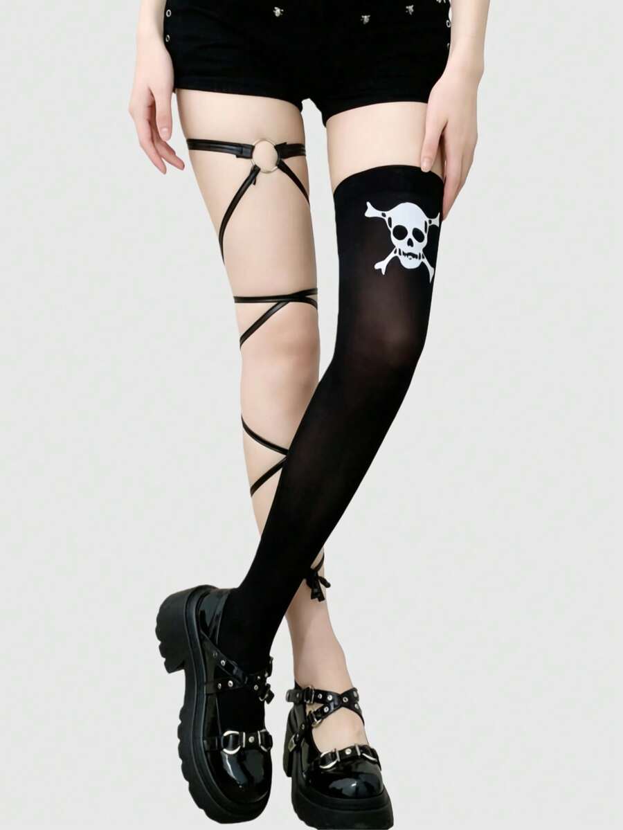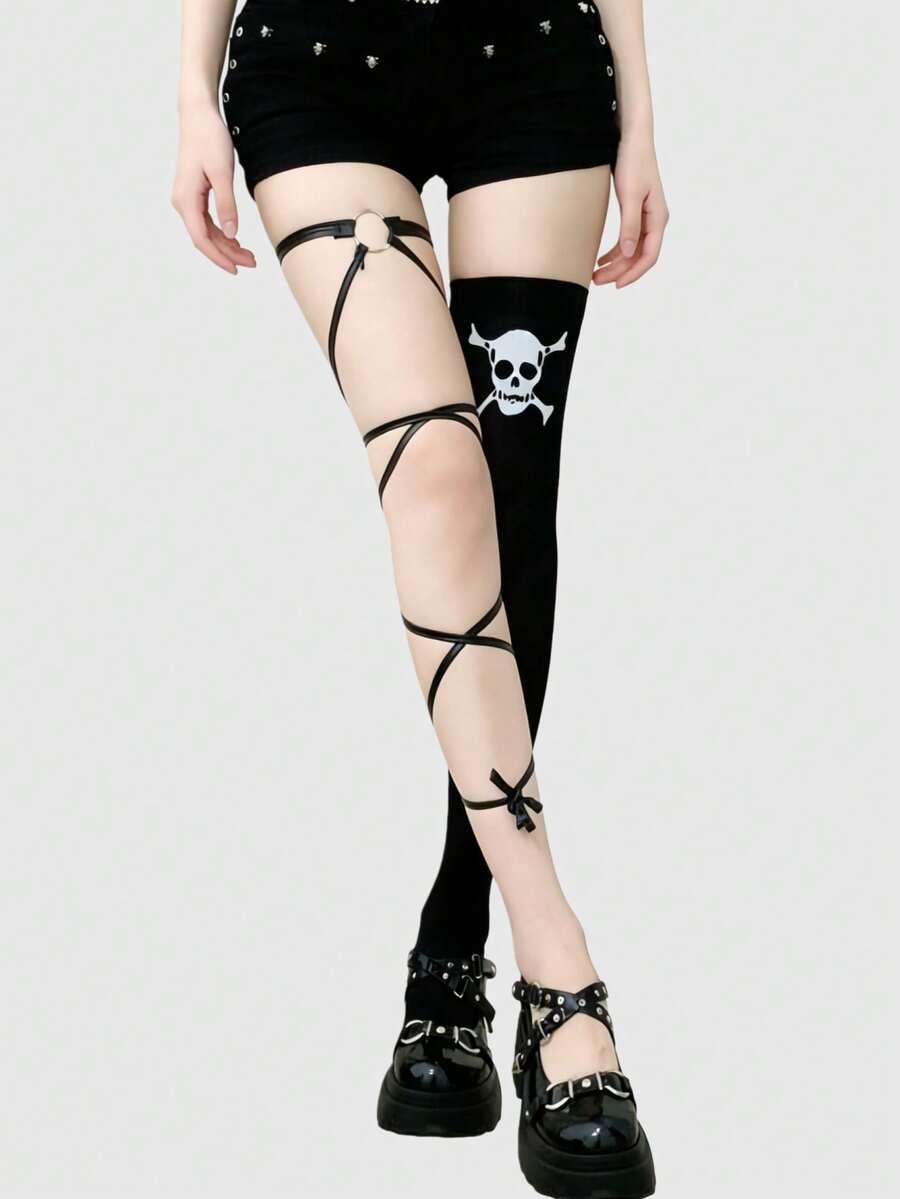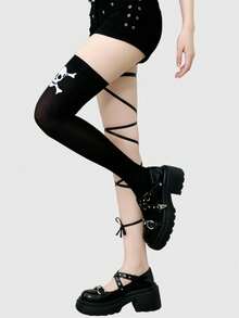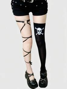 Grunge Punk Gothic Style Black & White Striped Skull Print Thigh High Socks, Y2K Punk Street-Wear Fashion, Suitable For Parties, Gatherings, Social Events, Halloween