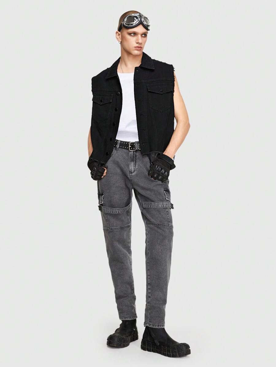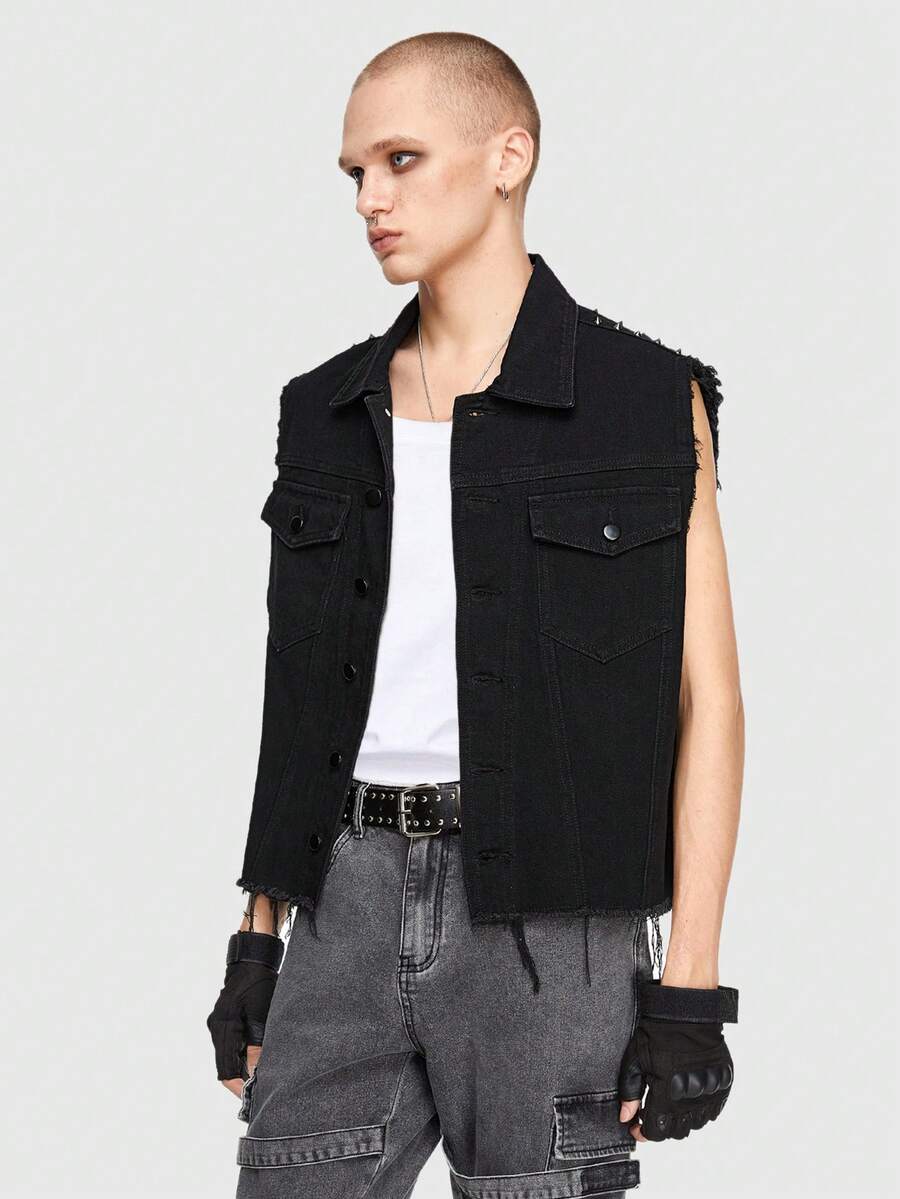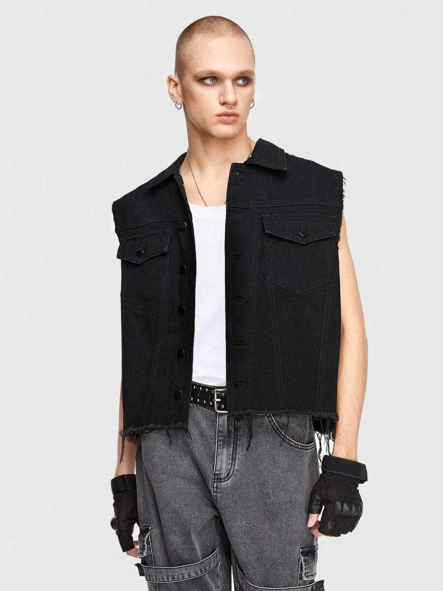 Grunge Punk Guys Flap Pocket Raw Trim Vest Denim Jacket