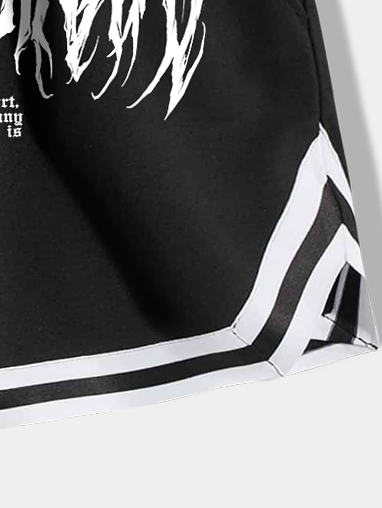 Grunge Punk Men Letter & Skeleton Print Tee & Striped Trim Drawstring Waist Shorts, School