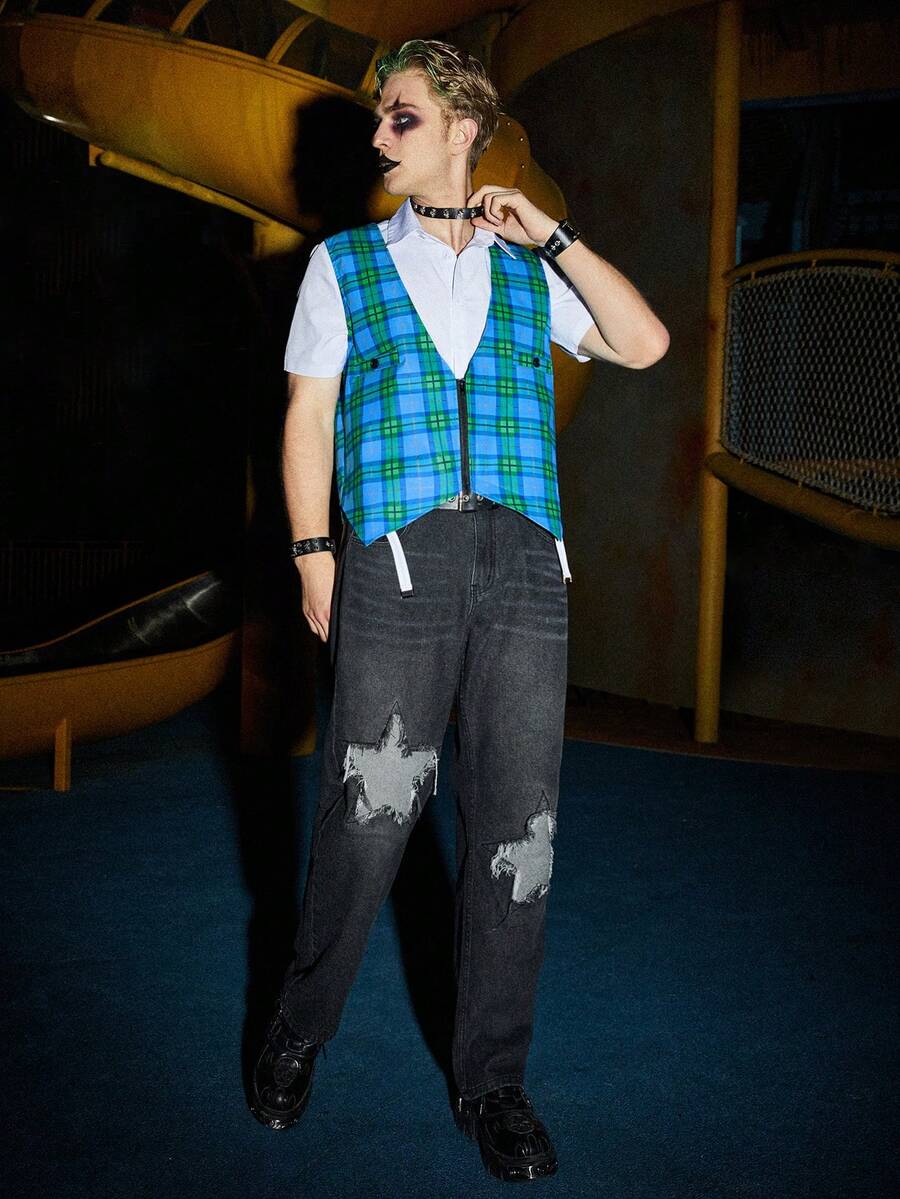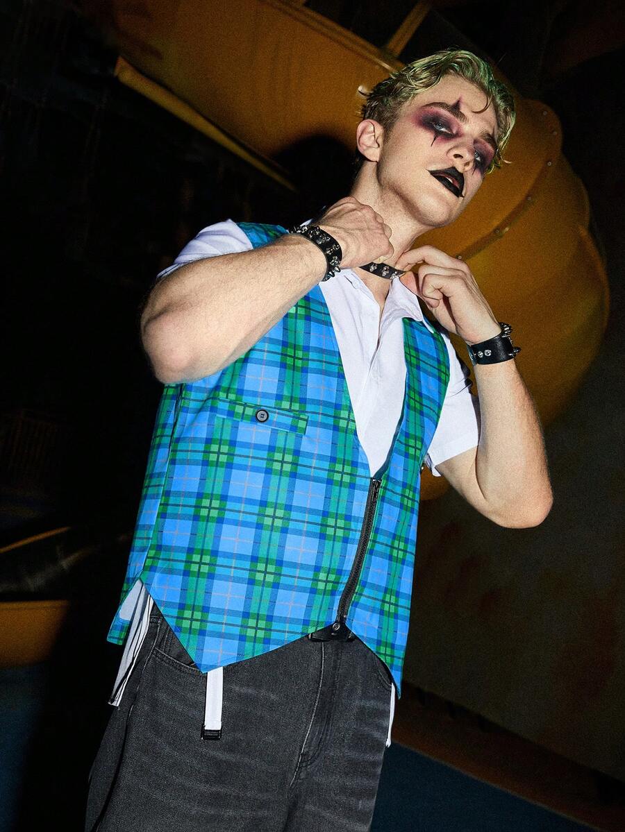Grunge Punk Guys Plaid Print Zip Up Vest Blazer Without Shirt