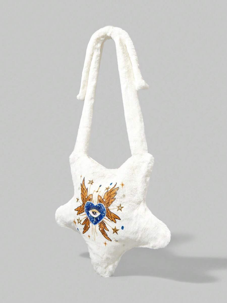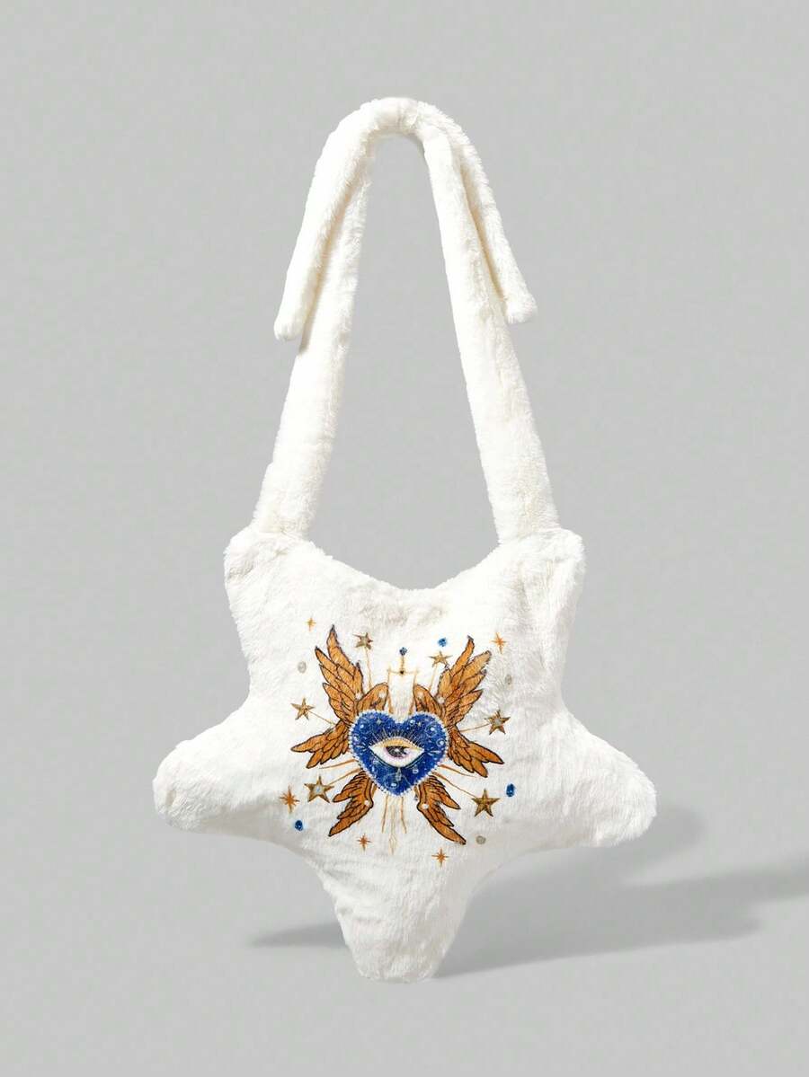 Grunge Punk Halloween Blue Heart Eye Wing Rhinestone Crystal Star Creative Design Personalized Sexy Y2K Casual Autumn/Winter White Star Plush Crossbody Bag