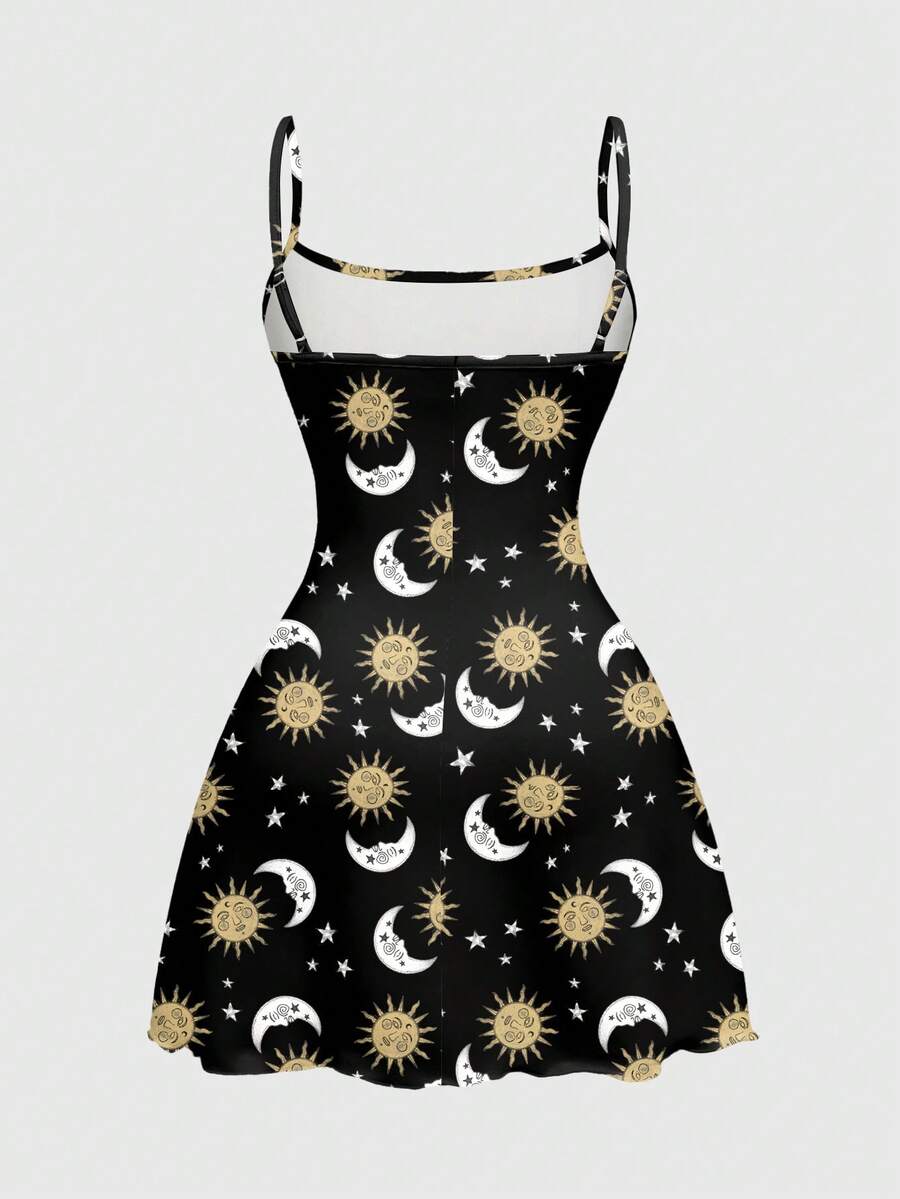 Grunge Punk Hippie Sun & Moon Graphic Black Sexy Spaghetti Strap Stretchy Plus Size Dress