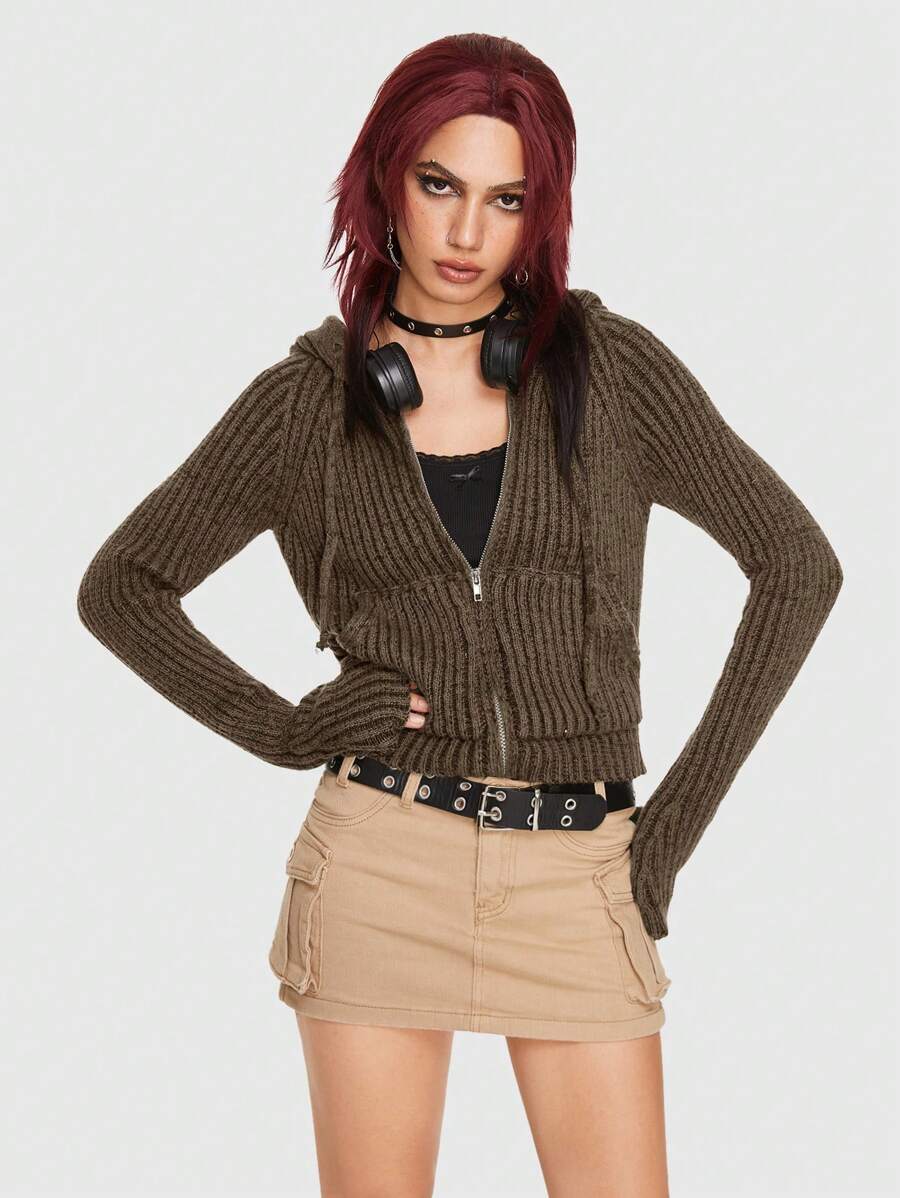 Grunge Punk Kangaroo Pocket Zip-Up Hooded Cardigan