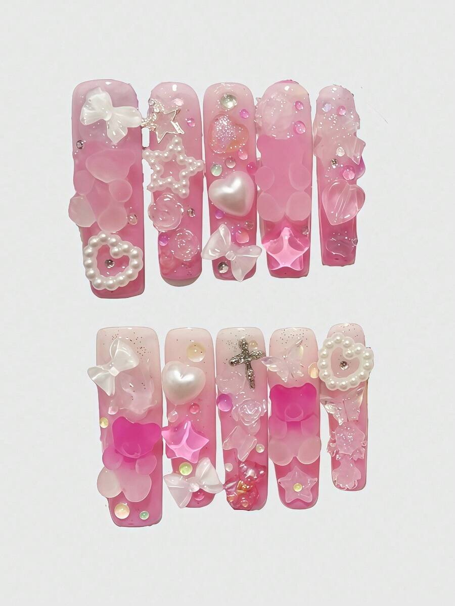 Grunge Punk Kawaii Punk Style Sweet Star Bow Cute Bear Romantic Heart-Shaped Pink Ombre Handmade False Nails, Dopamine Romantic Sweet Girl Wear, Suitable For Dates, Shopping, Music Festivals And Other Occasions