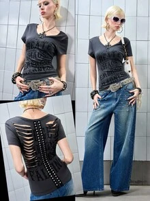Grunge Punk Kpop Cross & Letter Print Off-Shoulder Long Sleeve T-Shirt For Women, Romantic Punk Style