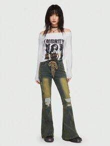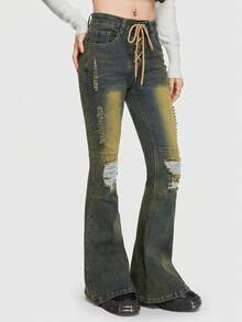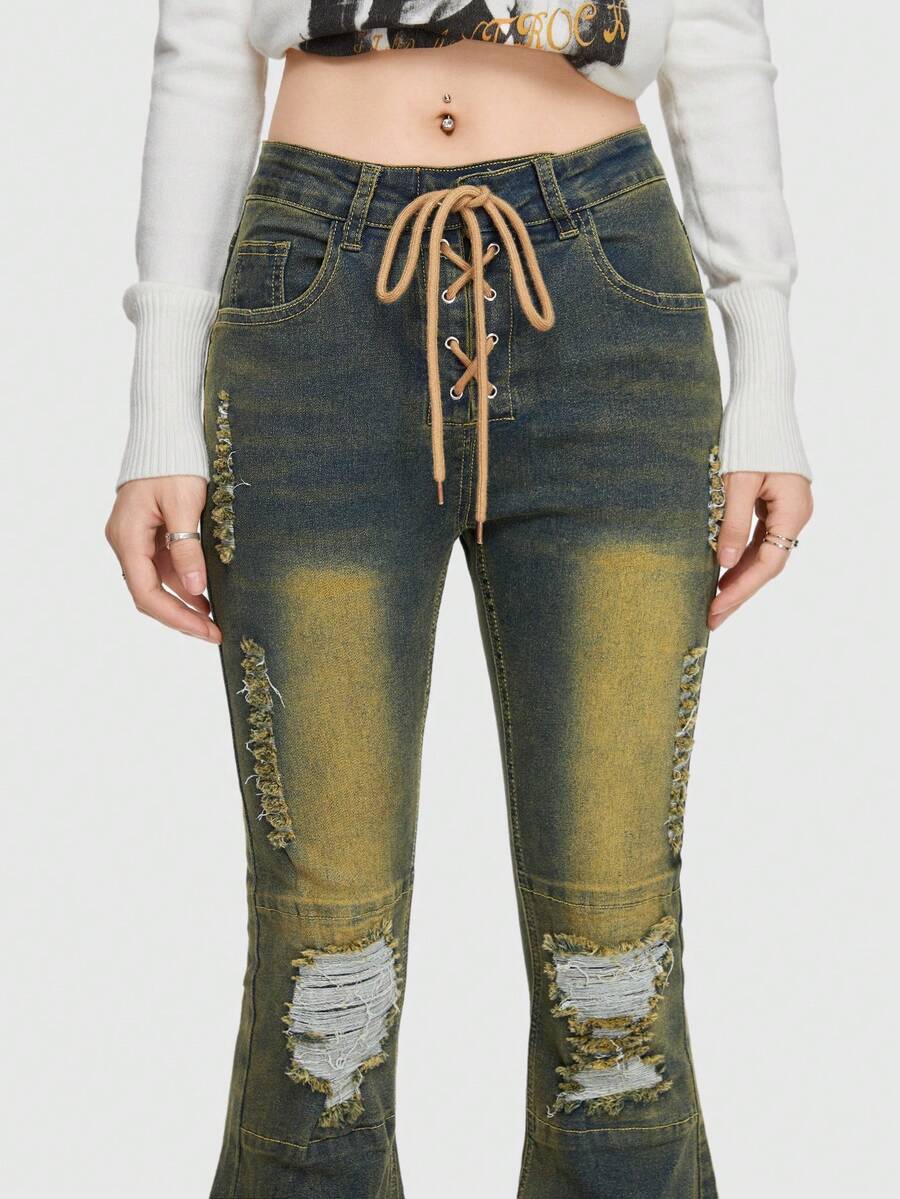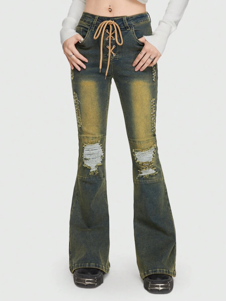 Grunge Punk Lace Up Ripped Flare Leg Jeans