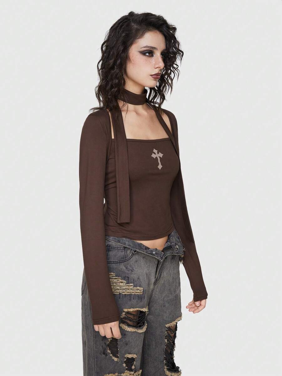 Grunge Punk Ladies' Khaki Cape Design Decorative Scarf Long Sleeve T-shirt