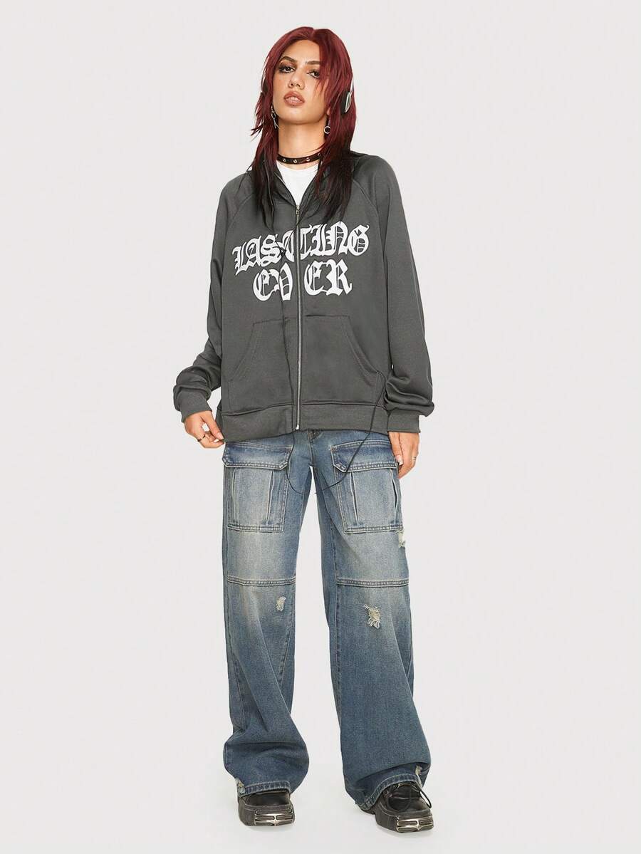 Grunge Punk Letter Graphic Zip Up Drawstring Hoodie