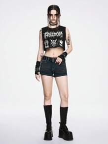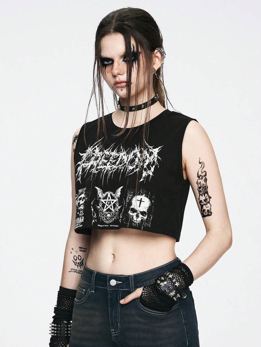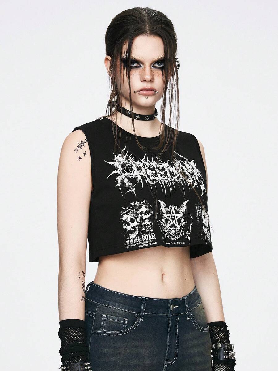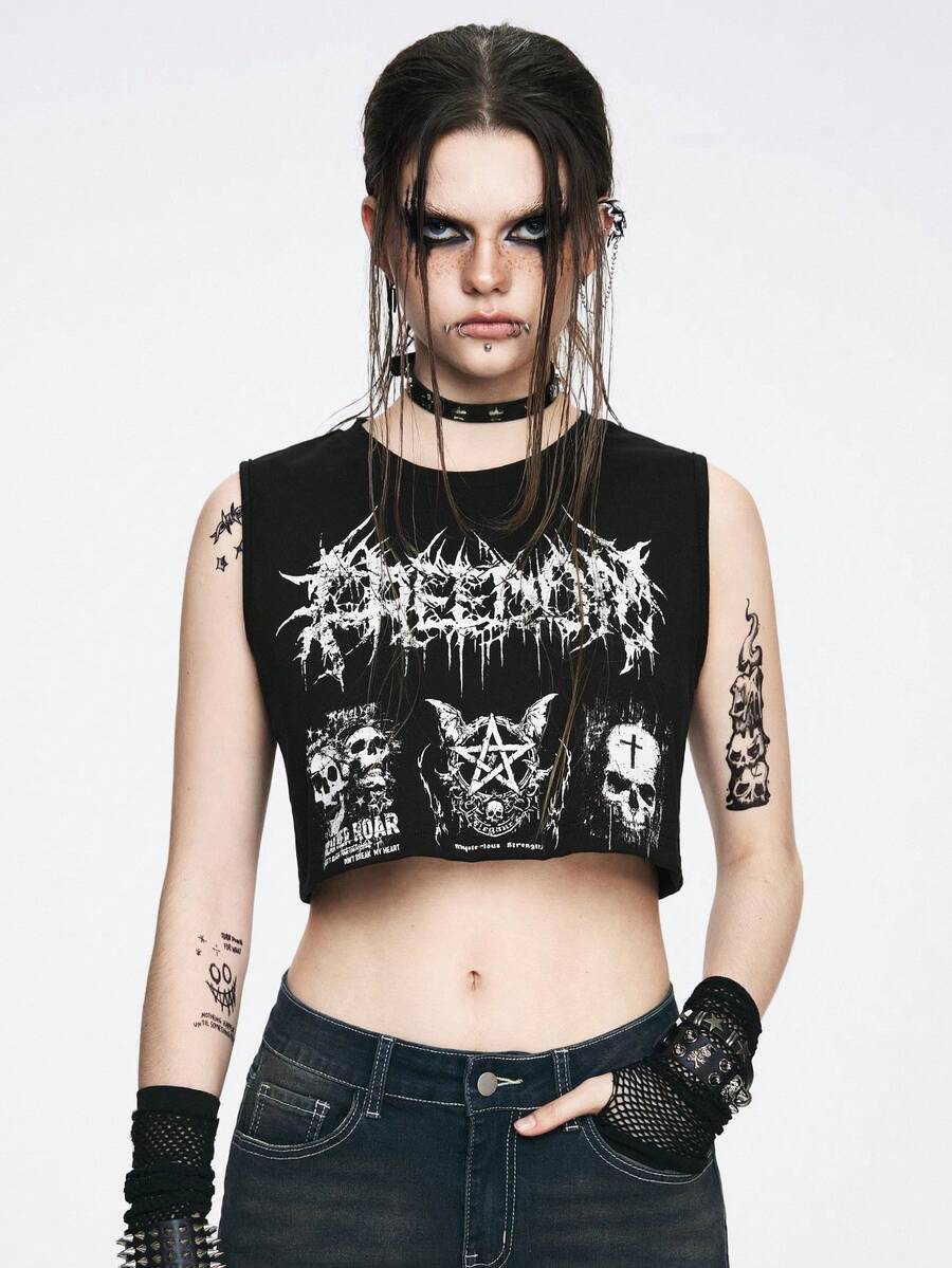 Grunge Punk Loose Cut Black Weird Punk Style Women's Skull Letter Print Tank Top