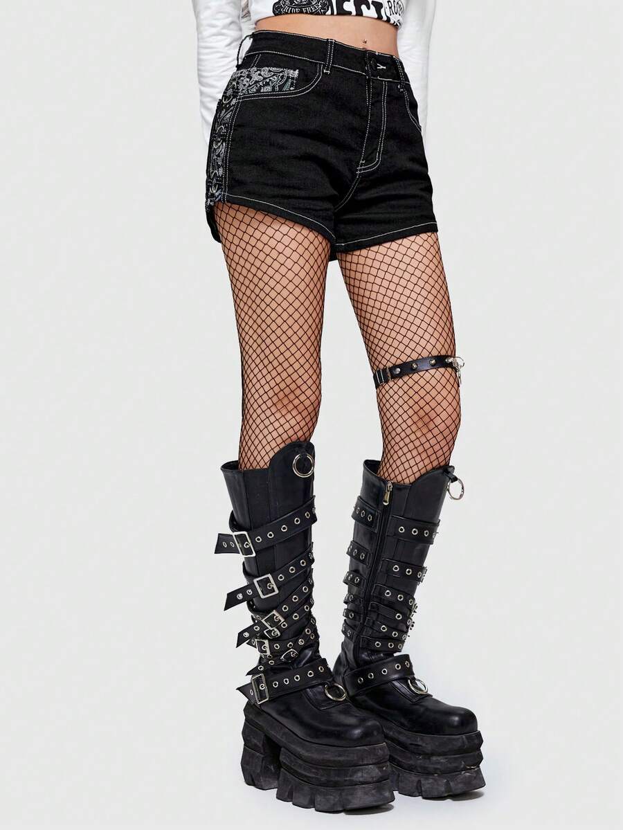 Grunge Punk Paisley Print Denim Shorts