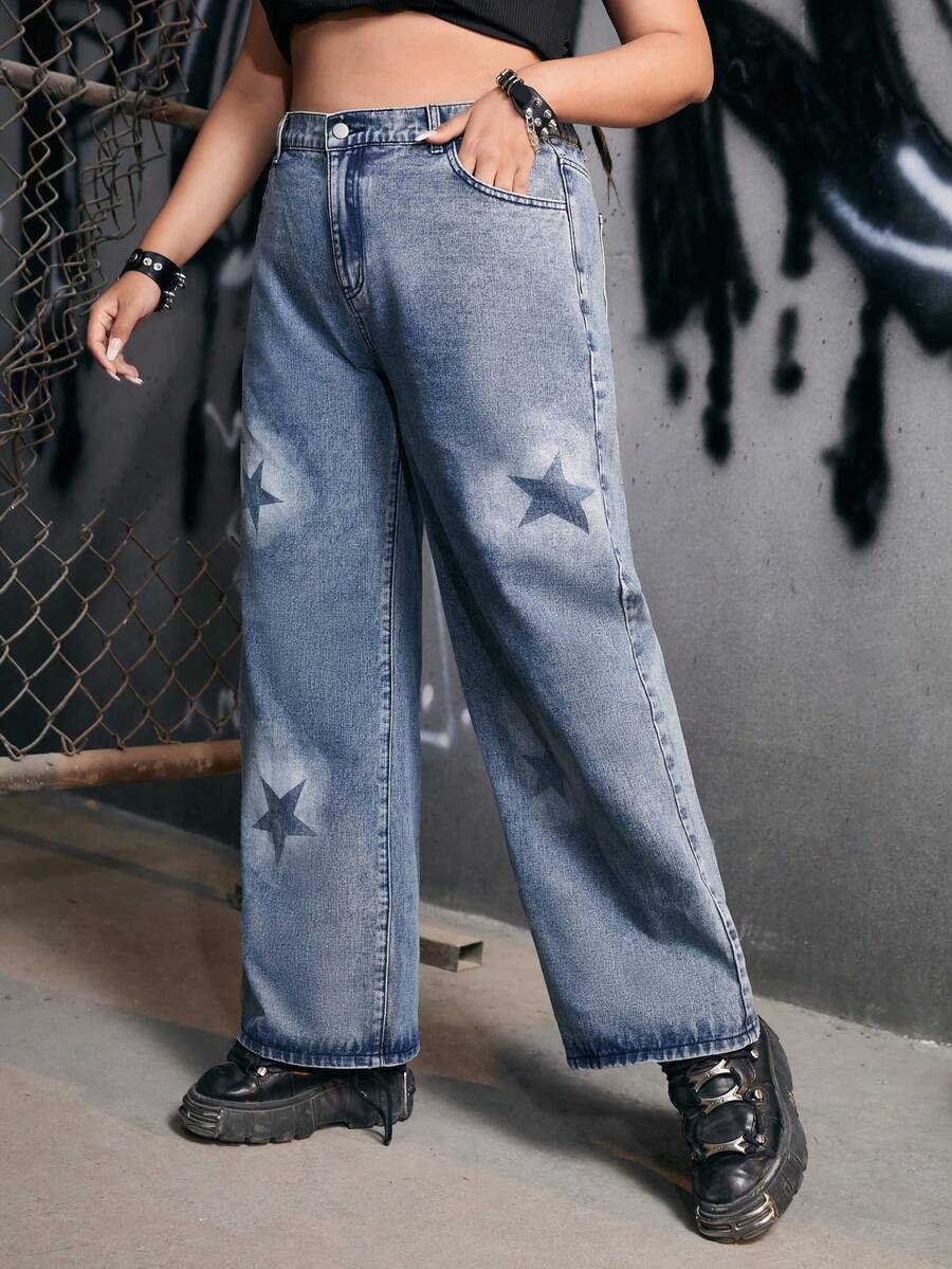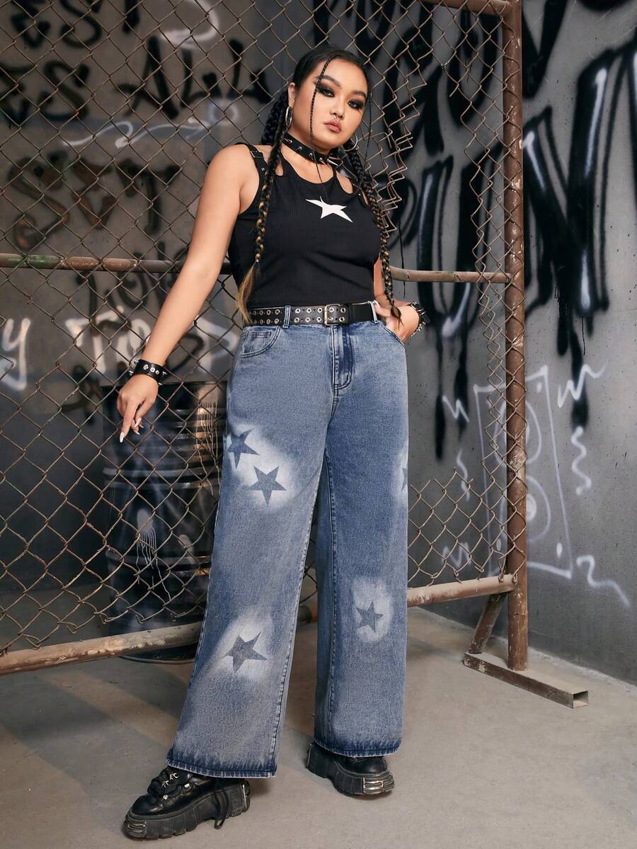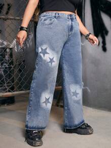 Grunge Punk Plus Star Print Wide Leg Jeans
