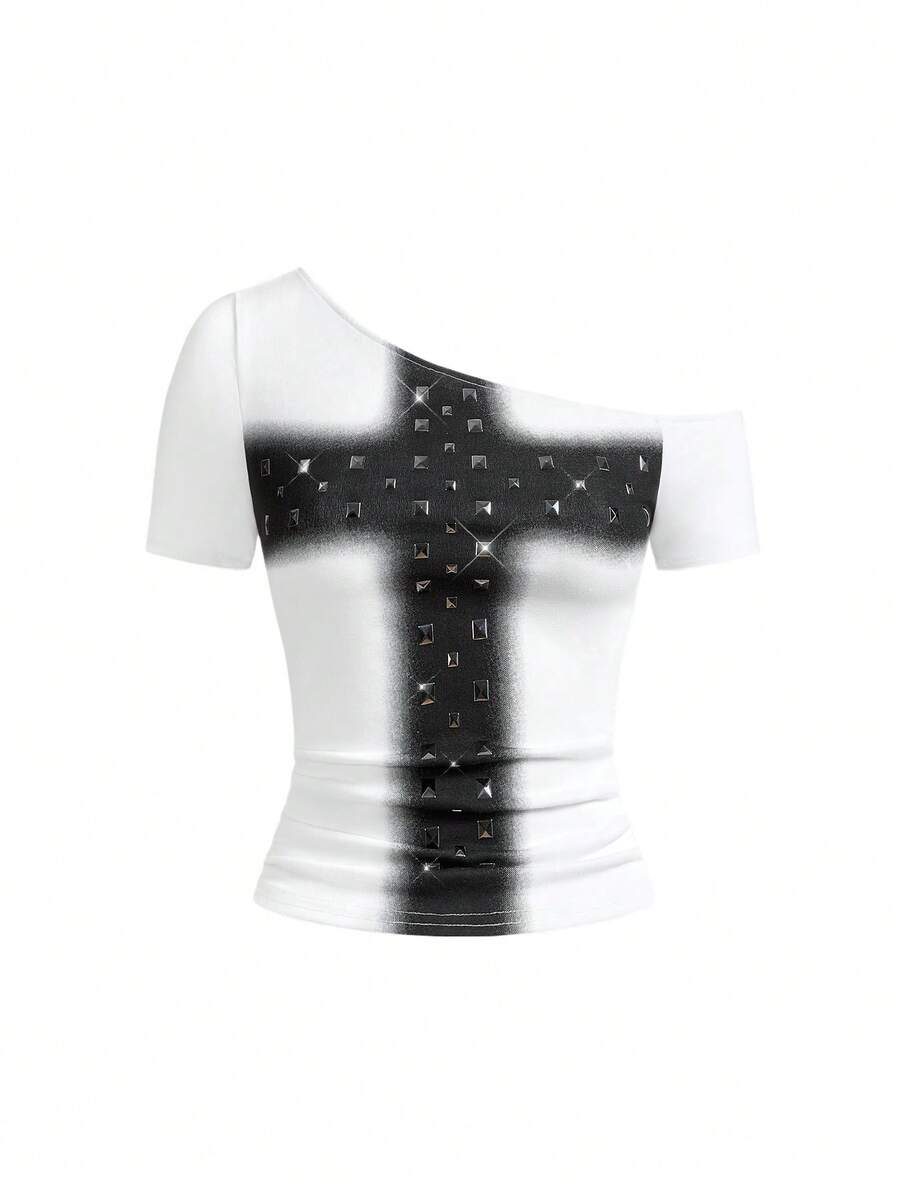 Grunge Punk Punk Metal Rivet Cross Print Tight Shoulder T-Shirt