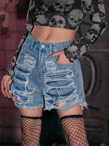 Grunge Punk Ripped Raw Hem Denim Shorts