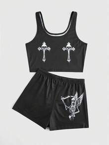 Grunge Punk Skeleton Print Tank Top & Shorts PJ Set