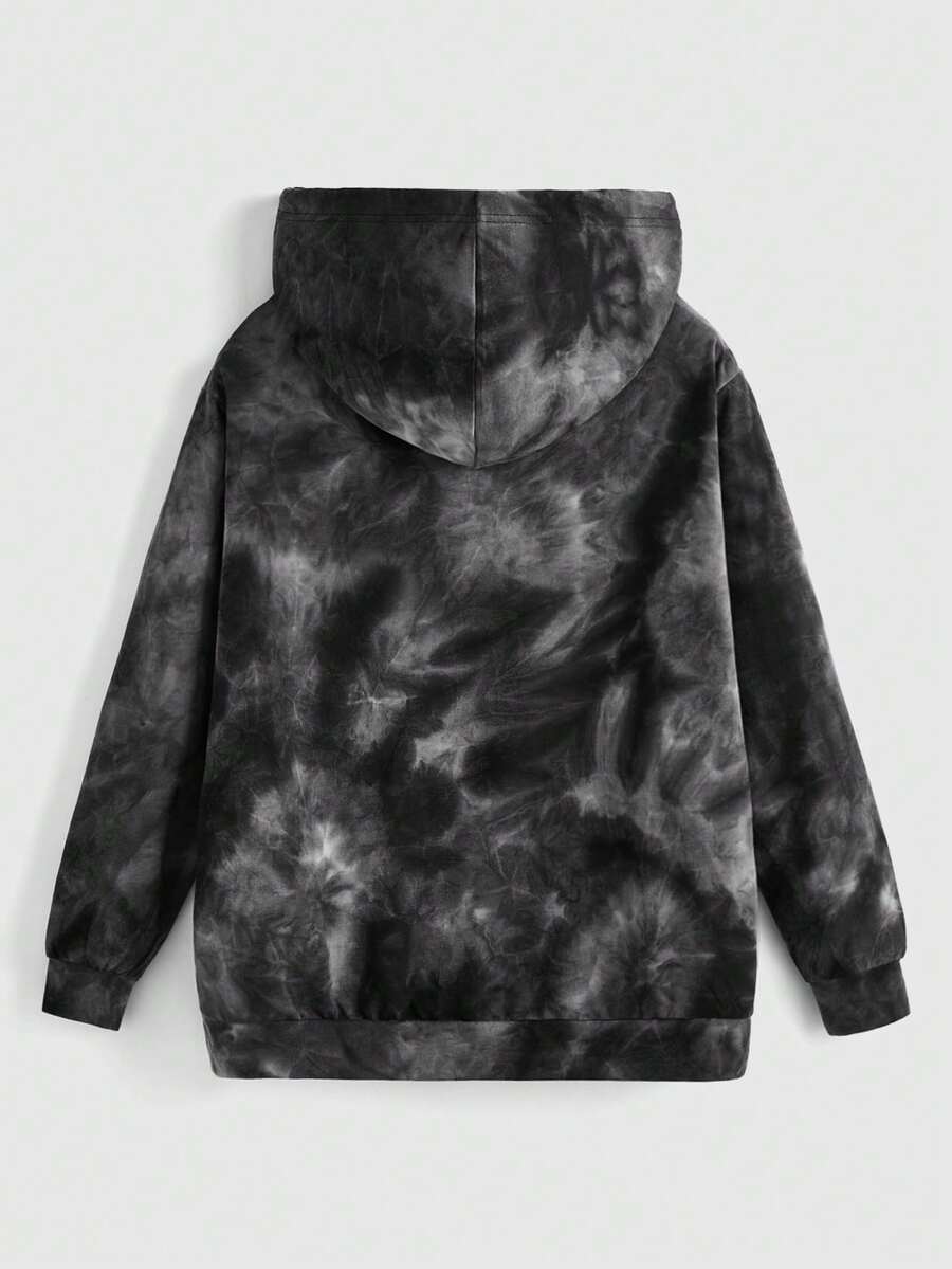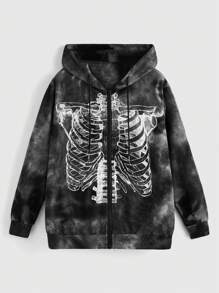 Grunge Punk Skeleton Print Tie Dye Zip Up Drawstring Hoodie