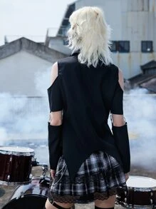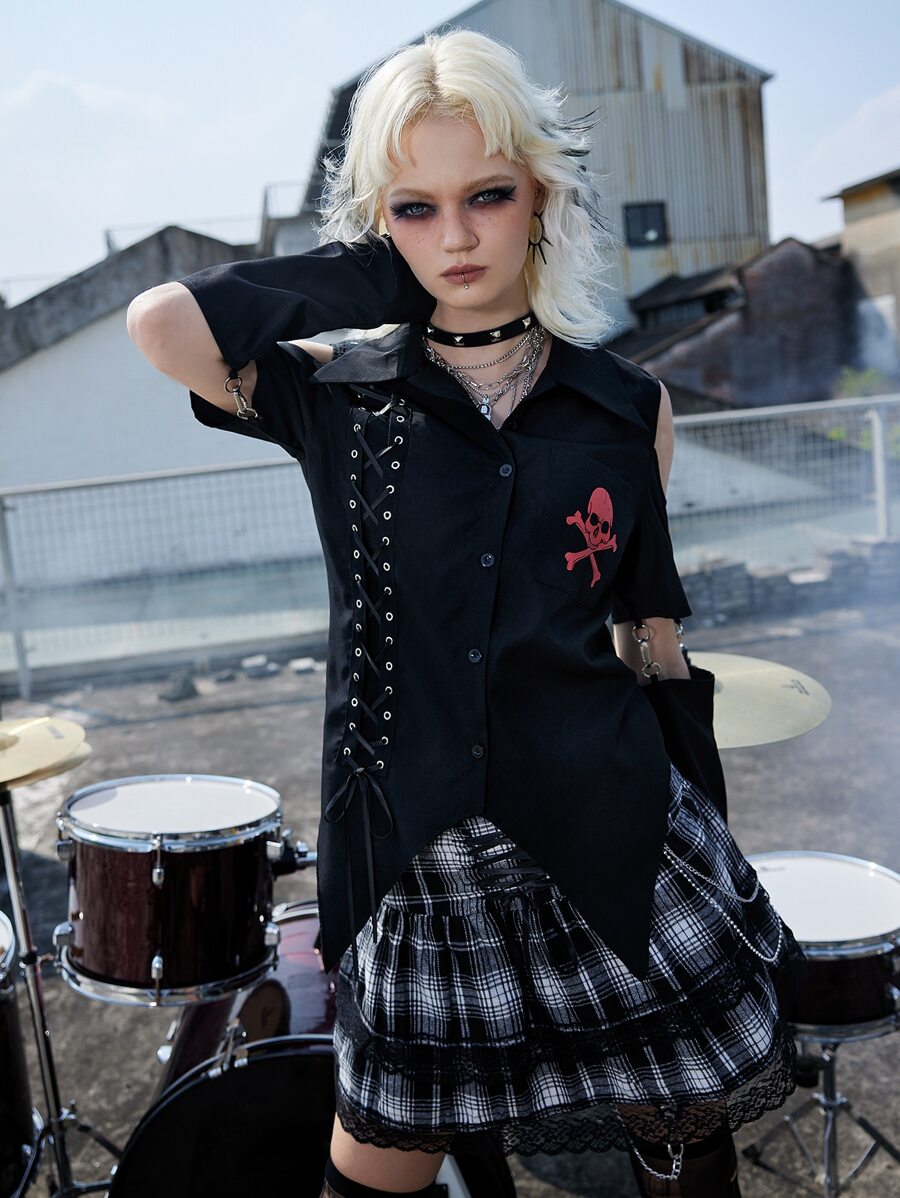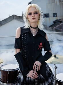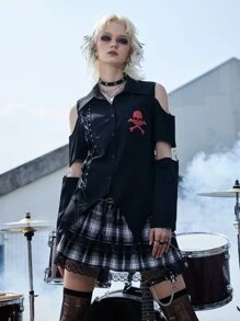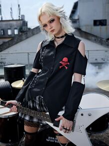 Grunge Punk Skull Print Cold Shoulder Cut Out Grommet Eyelet Shirt