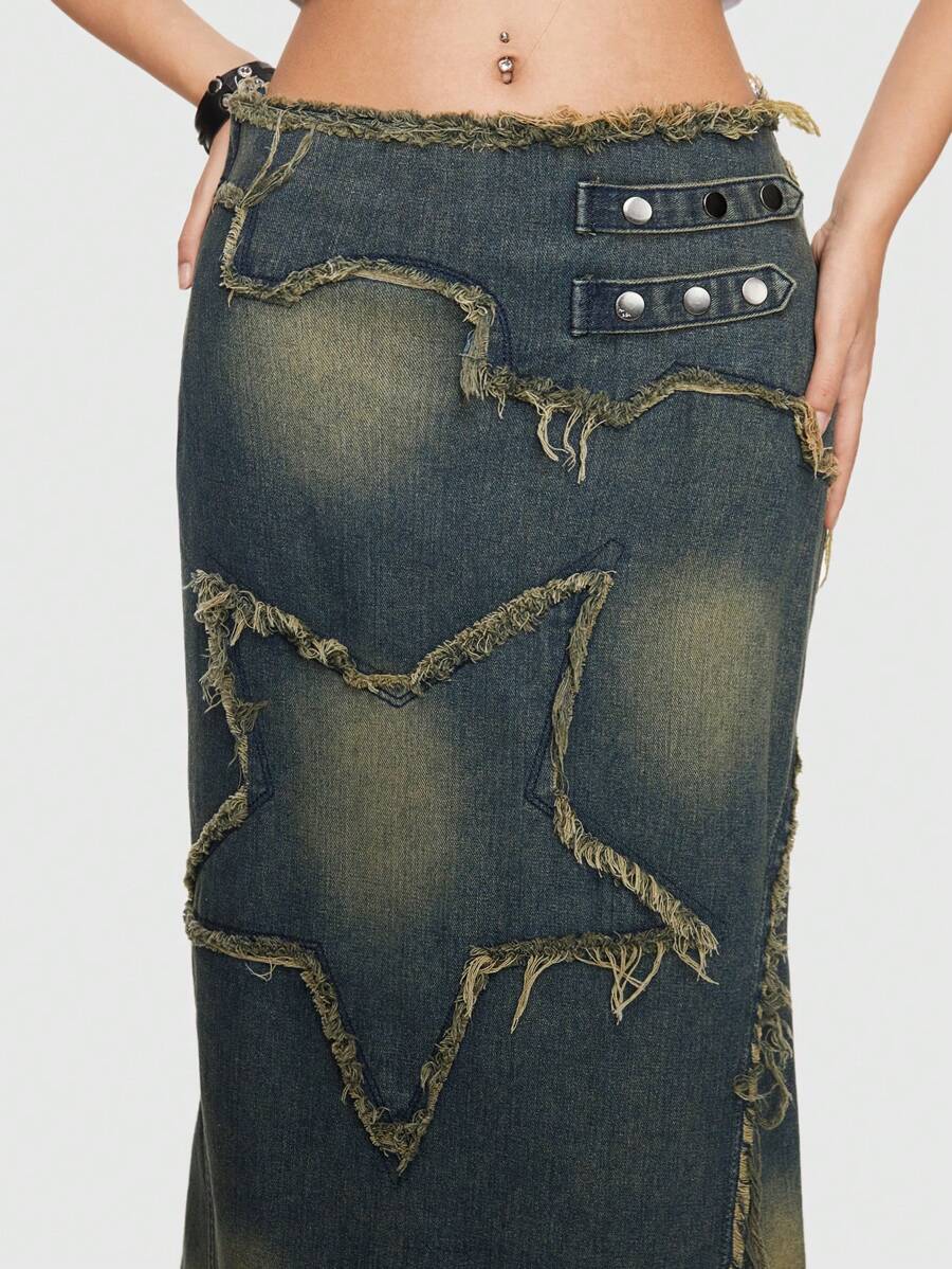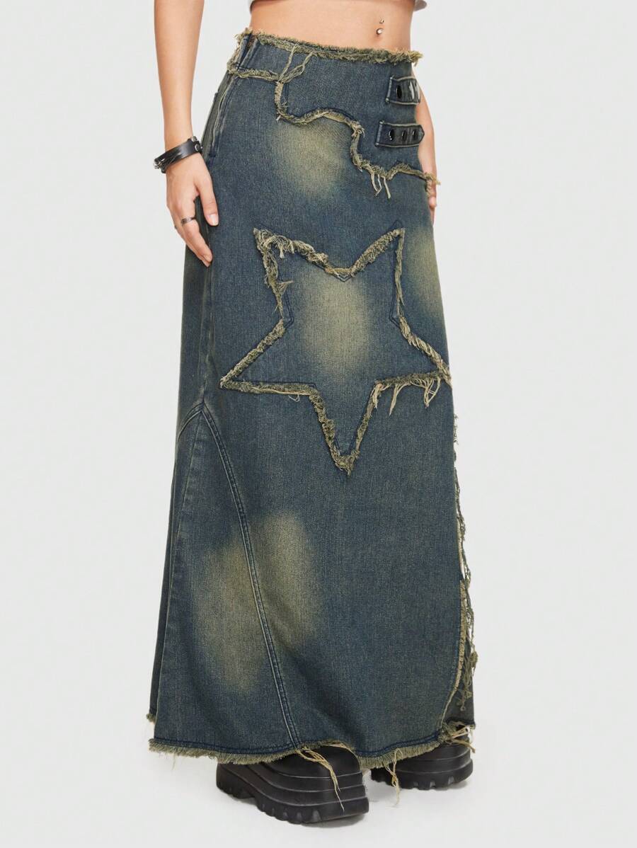 Grunge Punk Star Graphic Raw Hem Denim Skirt
