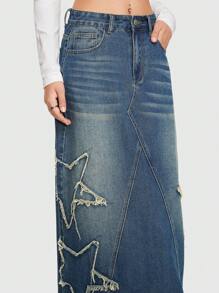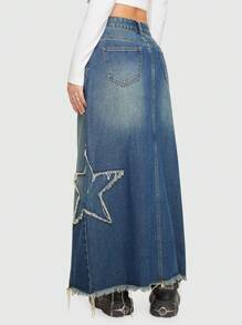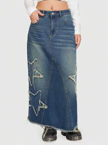 Grunge Punk Star Print Raw Hem Denim Skirt