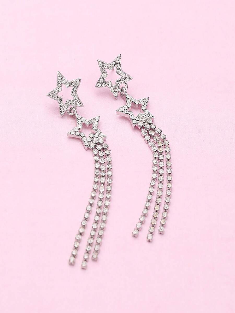 Grunge Punk Star Shaped Tassel Earrings With Full Rhinestone Decoration