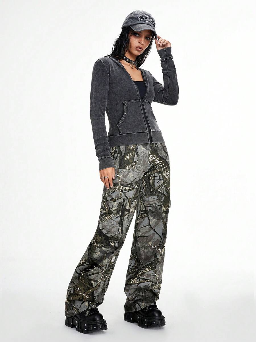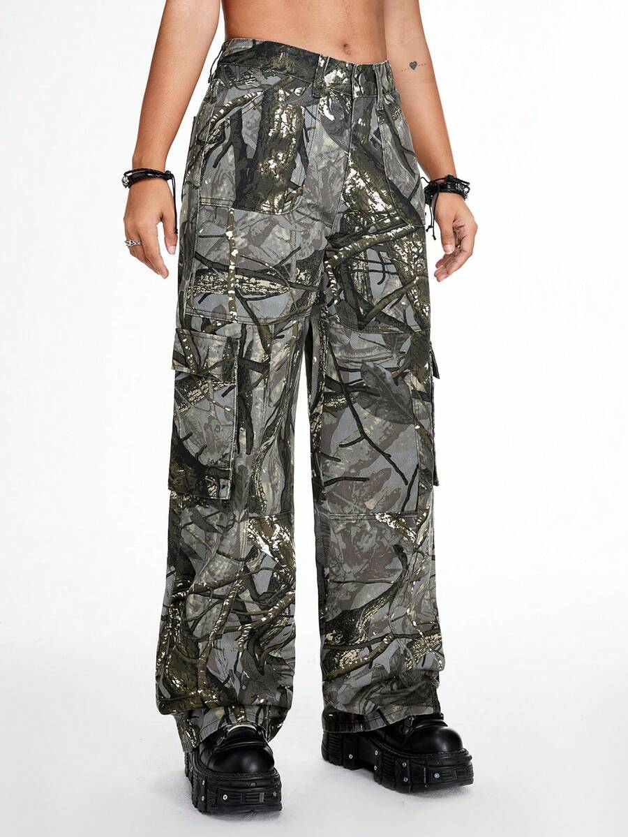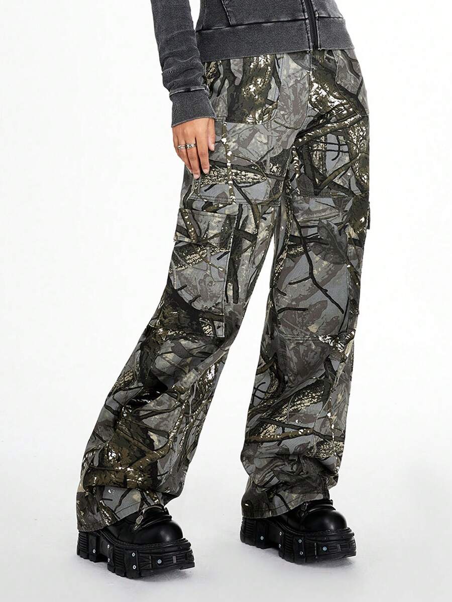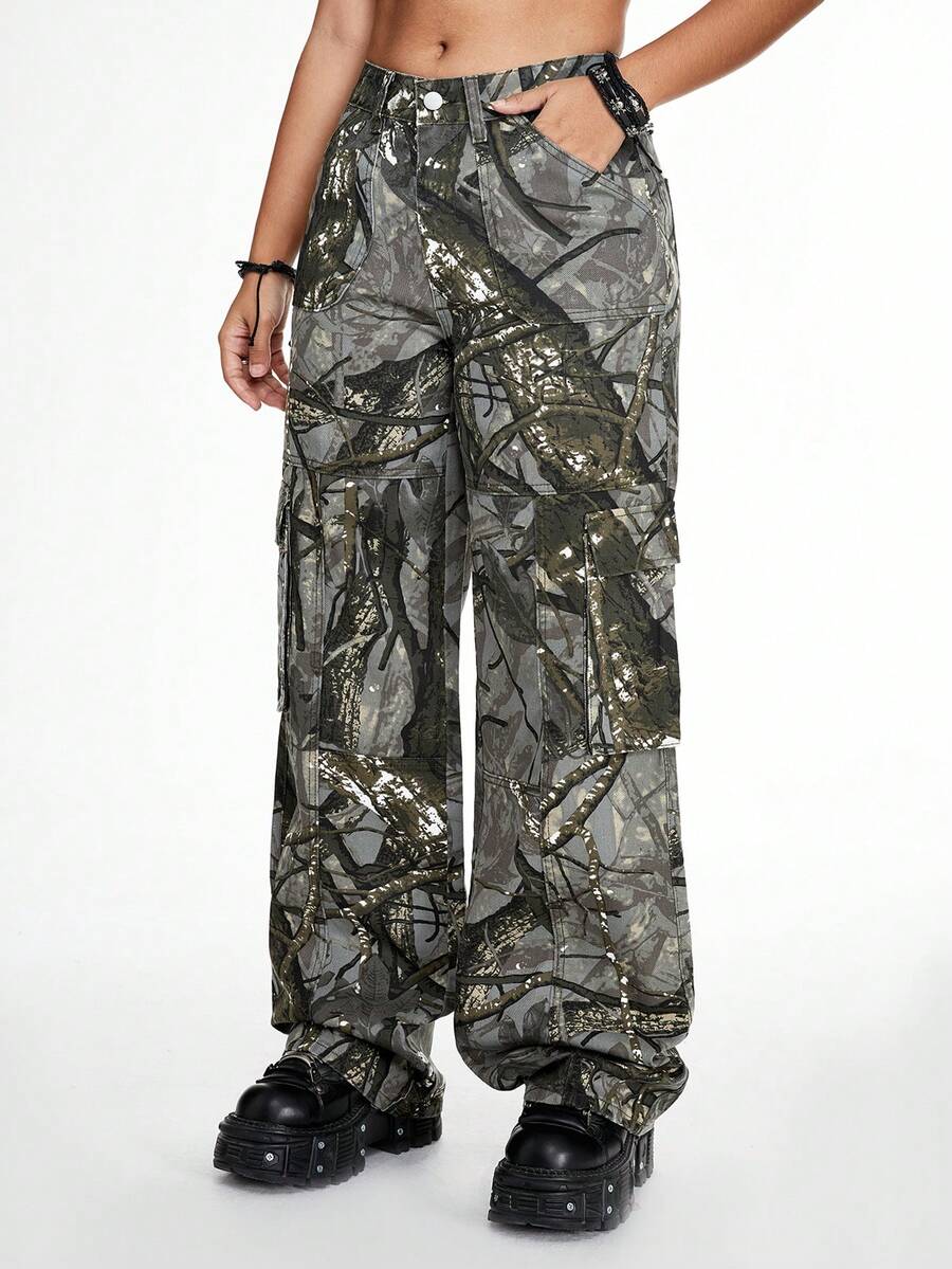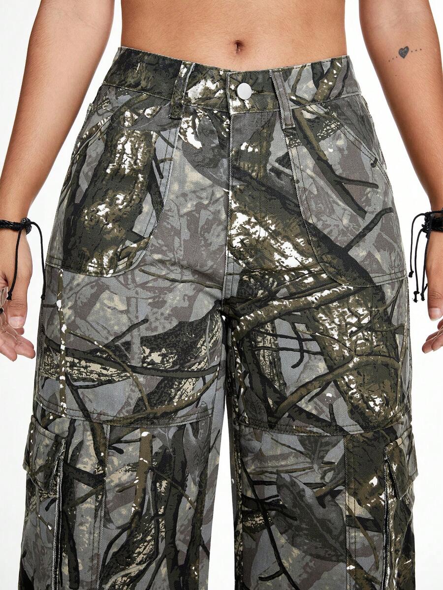 Grunge Punk Street Style Loose Straight Wide Leg Woven Plant Printed Women's Jeans