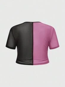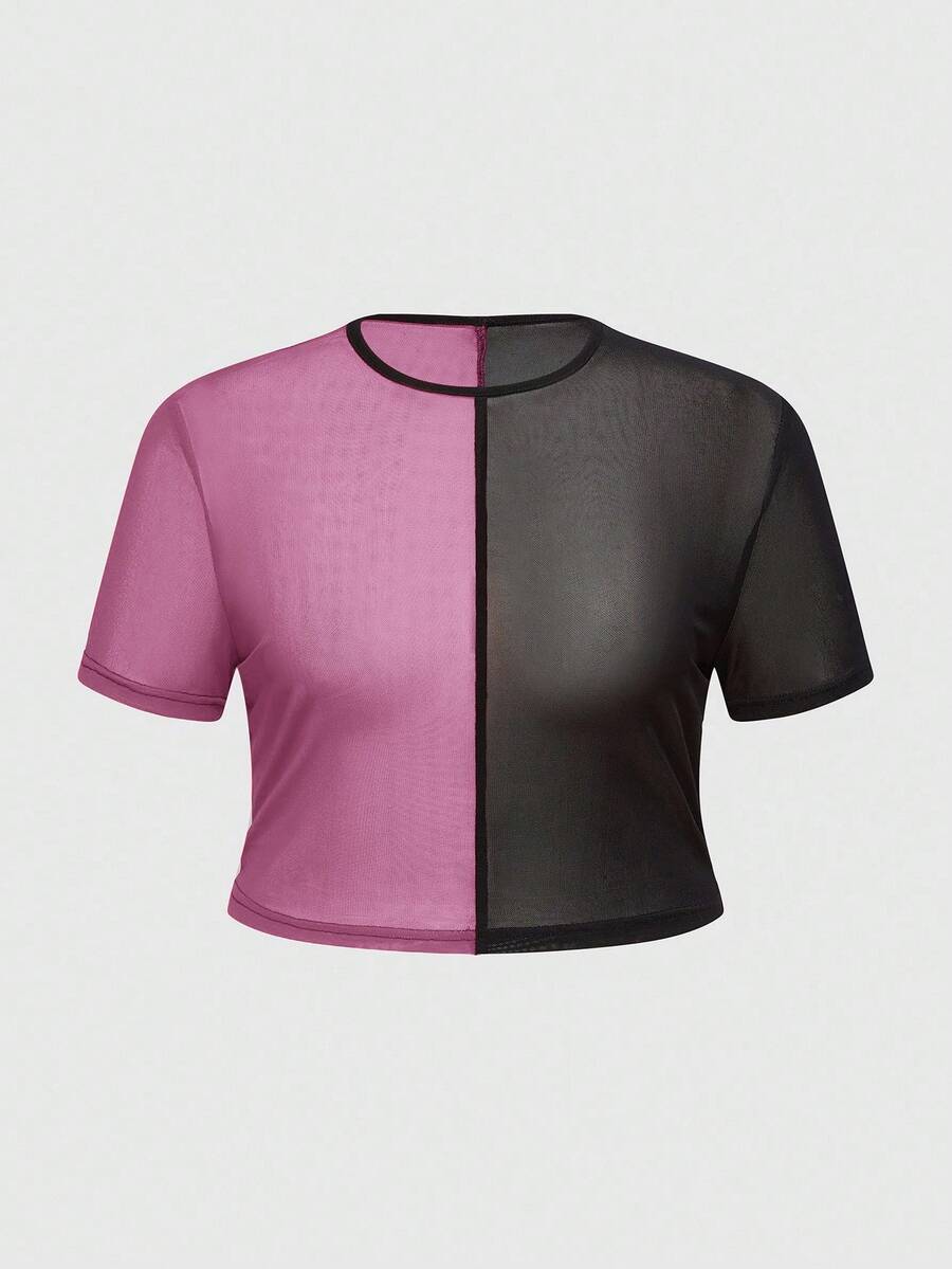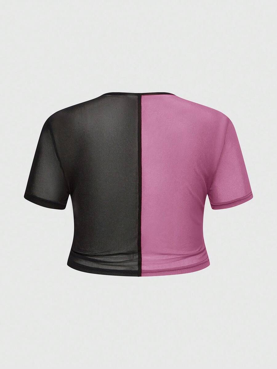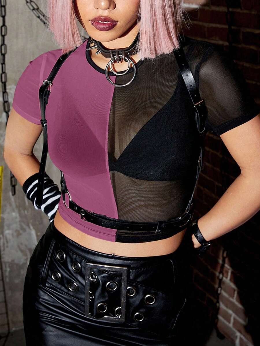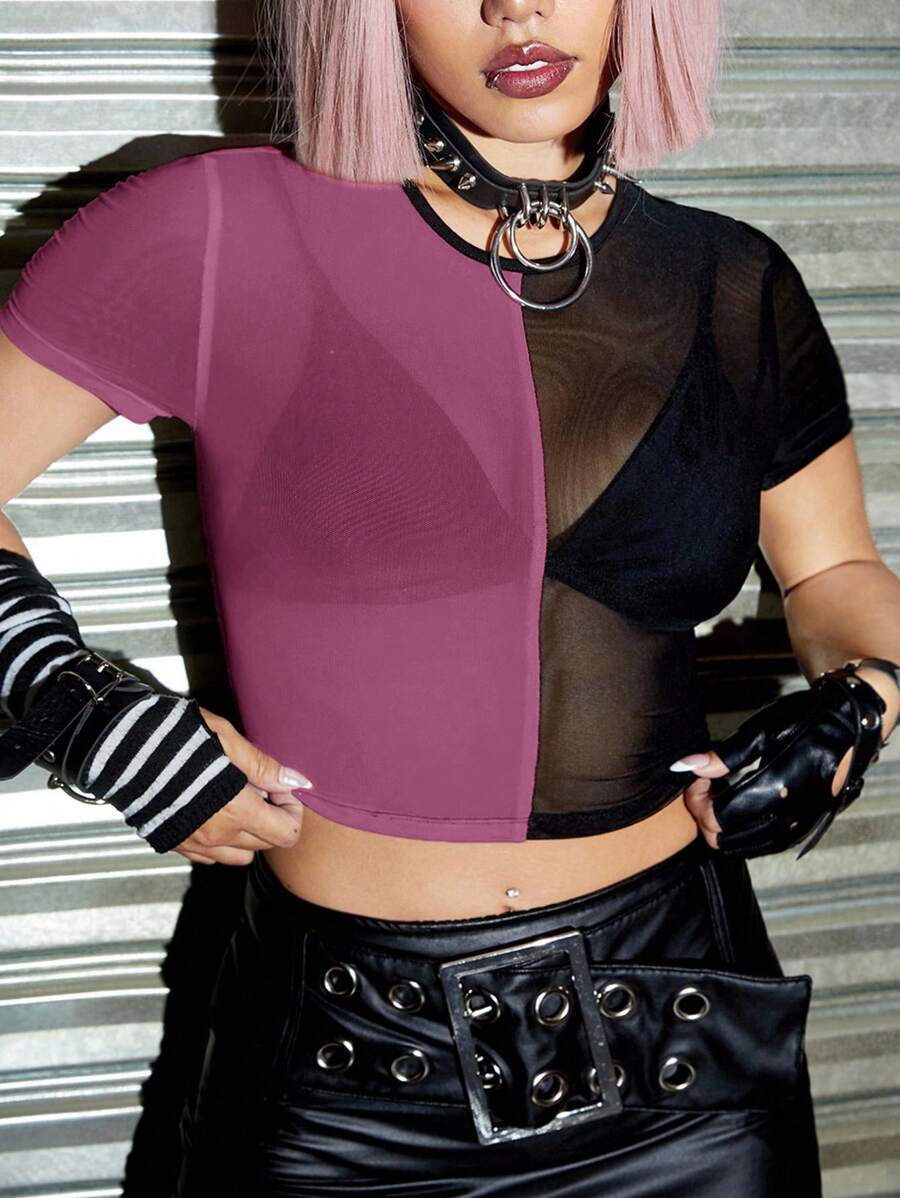 Grunge Punk Summer Red & Purple Mesh Patchwork Round Neck Short Sleeve Cropped Fitted T-Shirt For Plus Size Women