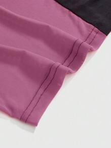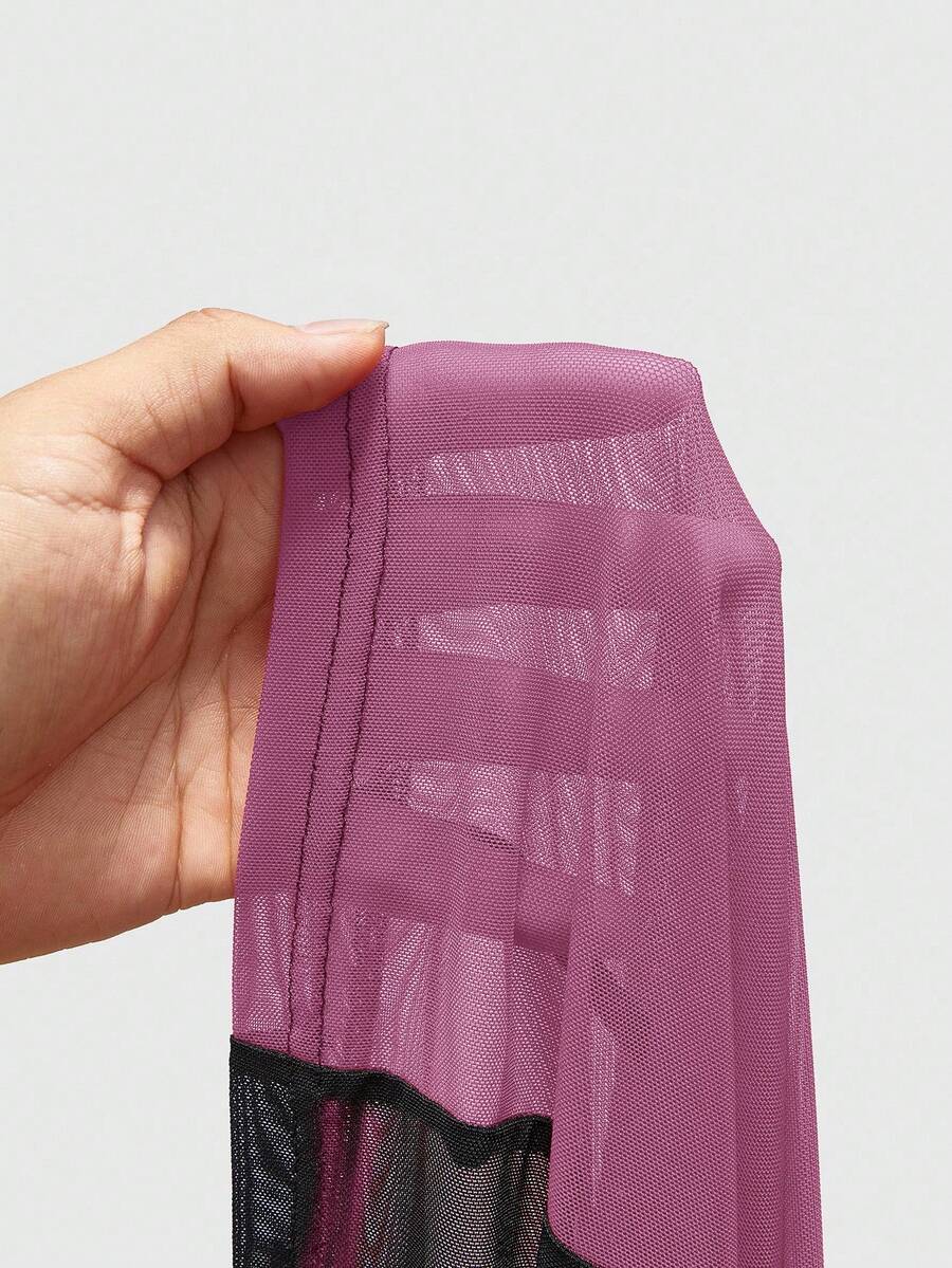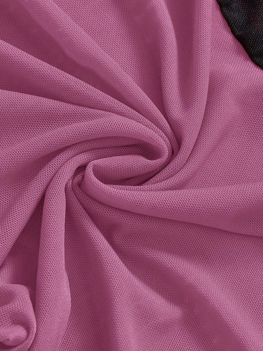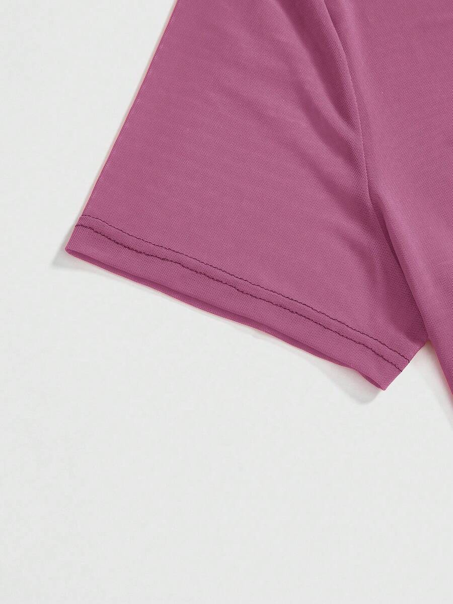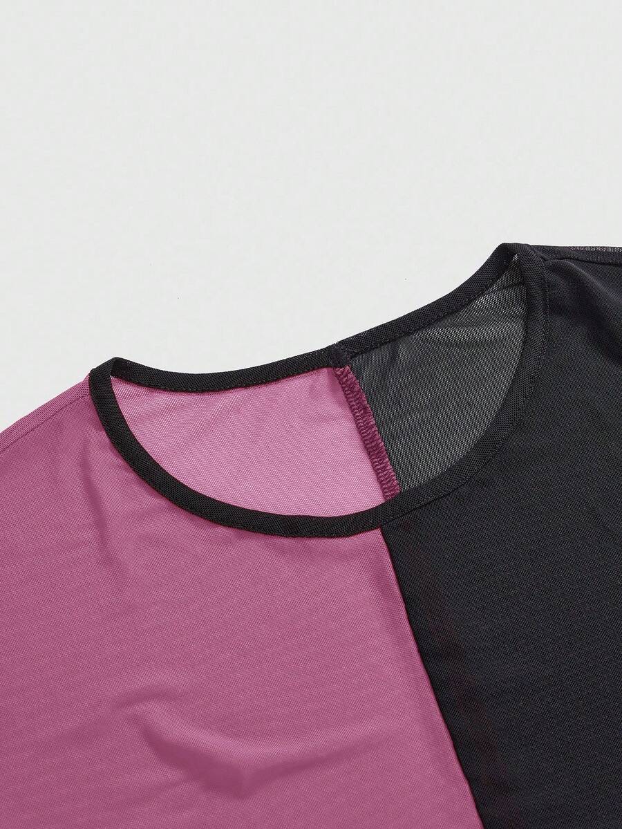 Grunge Punk Summer Red & Purple Mesh Patchwork Round Neck Short Sleeve Cropped Fitted T-Shirt For Plus Size Women