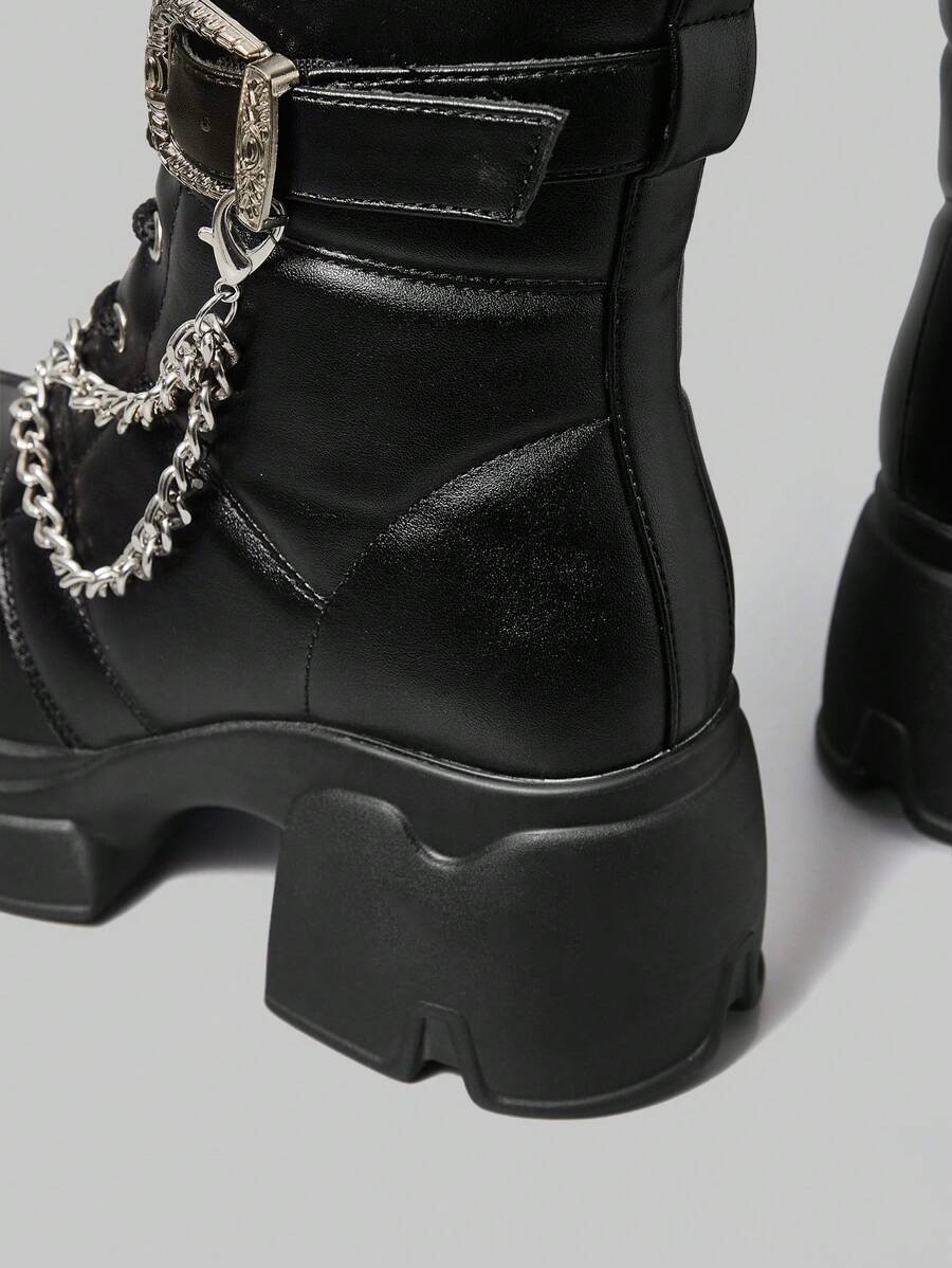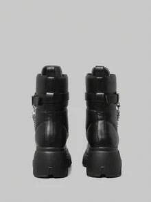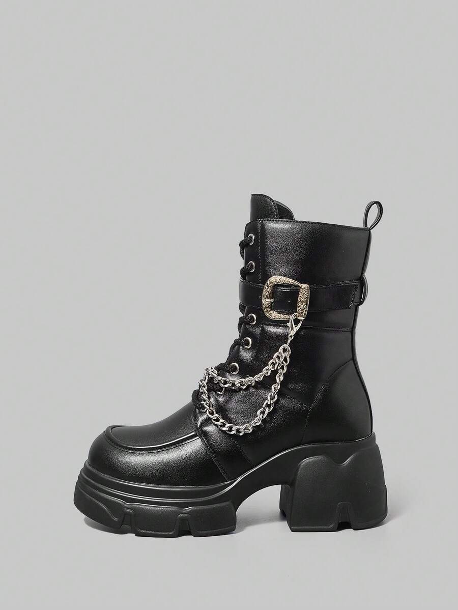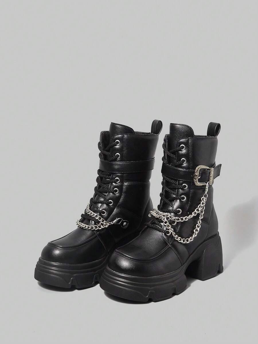 Grunge Punk Women Buckle Decor Lace-up Front Platform Chunky Heeled Boots, Punk Outdoor Fashion Boots