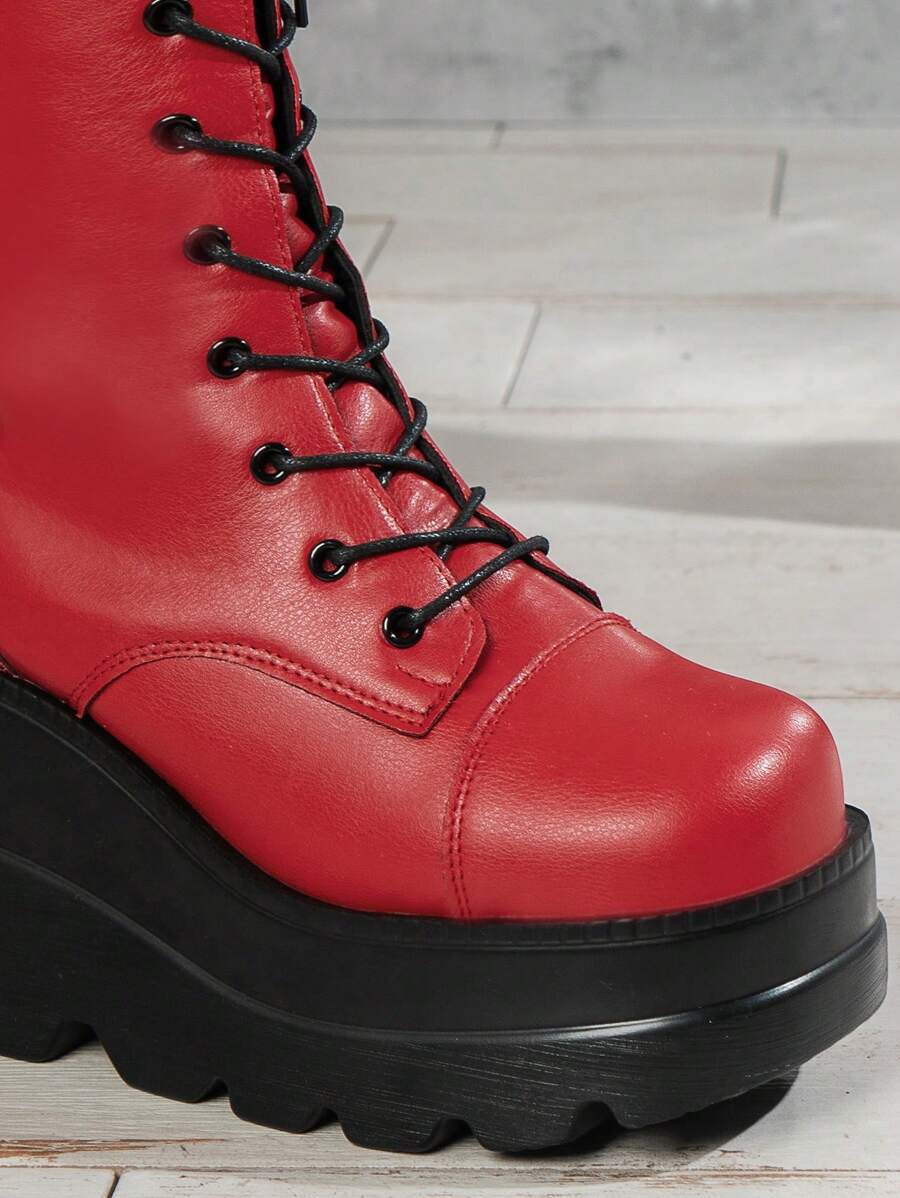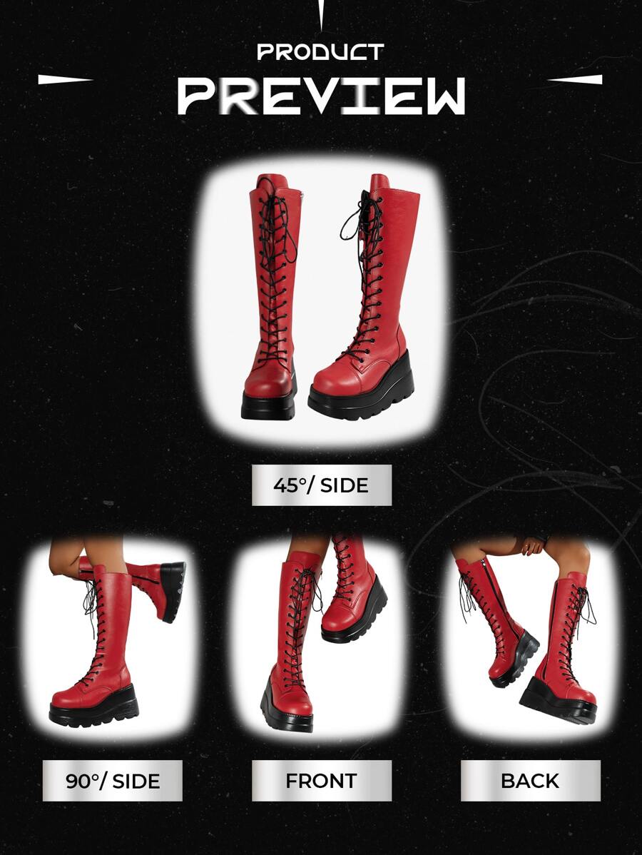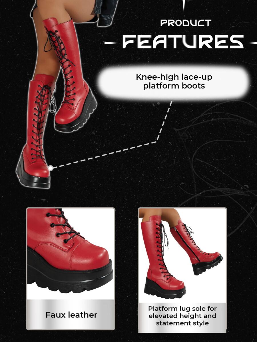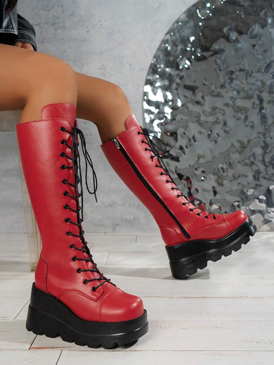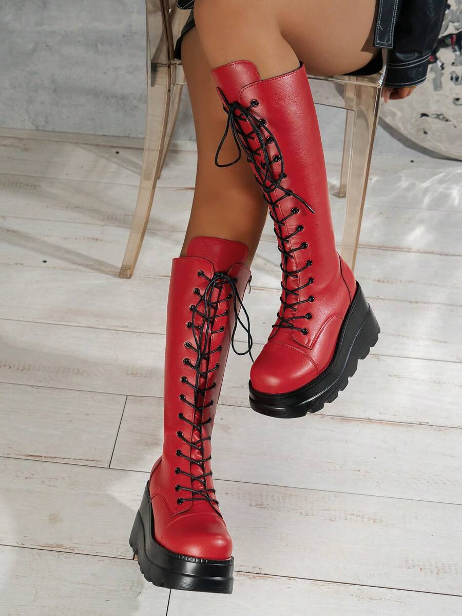 Grunge Punk Women'S 2024 Autumn And Winter New Round Toe Lace-Up Side Zipper Big Red Punk Wedge Thick-Soled Boots Fall For Christmas And New Year Holiday Valentines Spring Shoes
