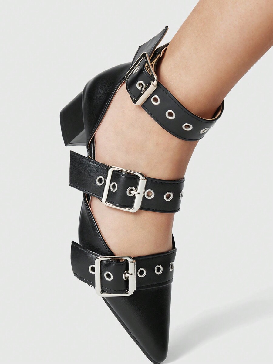 Grunge Punk Women's Black High Heel Shoes, Closed Toe Pointed Toe Sexy Dress Shoes, Strap Buckle With Rivets Punk Rock Style Chunky Heel Loafer Pumps Spring Shoes Spring Break Easter Prom Heels