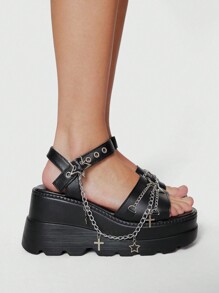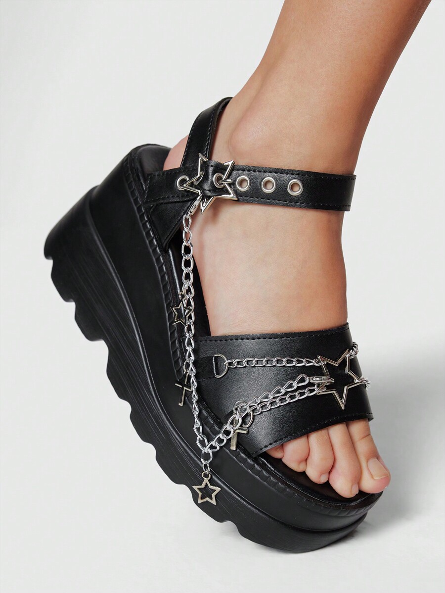 Grunge Punk Women's Black Rock Punk Gothic Sandals, Summer Open Toe Chain Roman Dress Party Shoes, Star Platform Wedge Sandals Spring Shoes Spring Break Easter