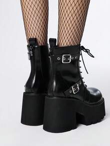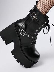Grunge Punk Women's Casual Round Toe Thick Bottom Wedge Ankle Boots, Gothic Punk Style Metal Eyelets & Buckle Decor, Comfortable Black Leather Chunky Heel Booties For Outdoor, Commute, Party