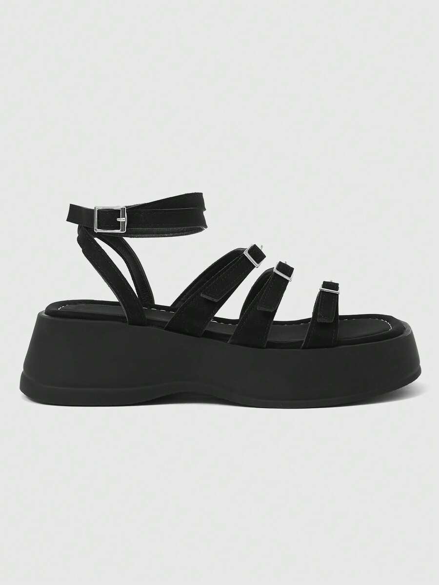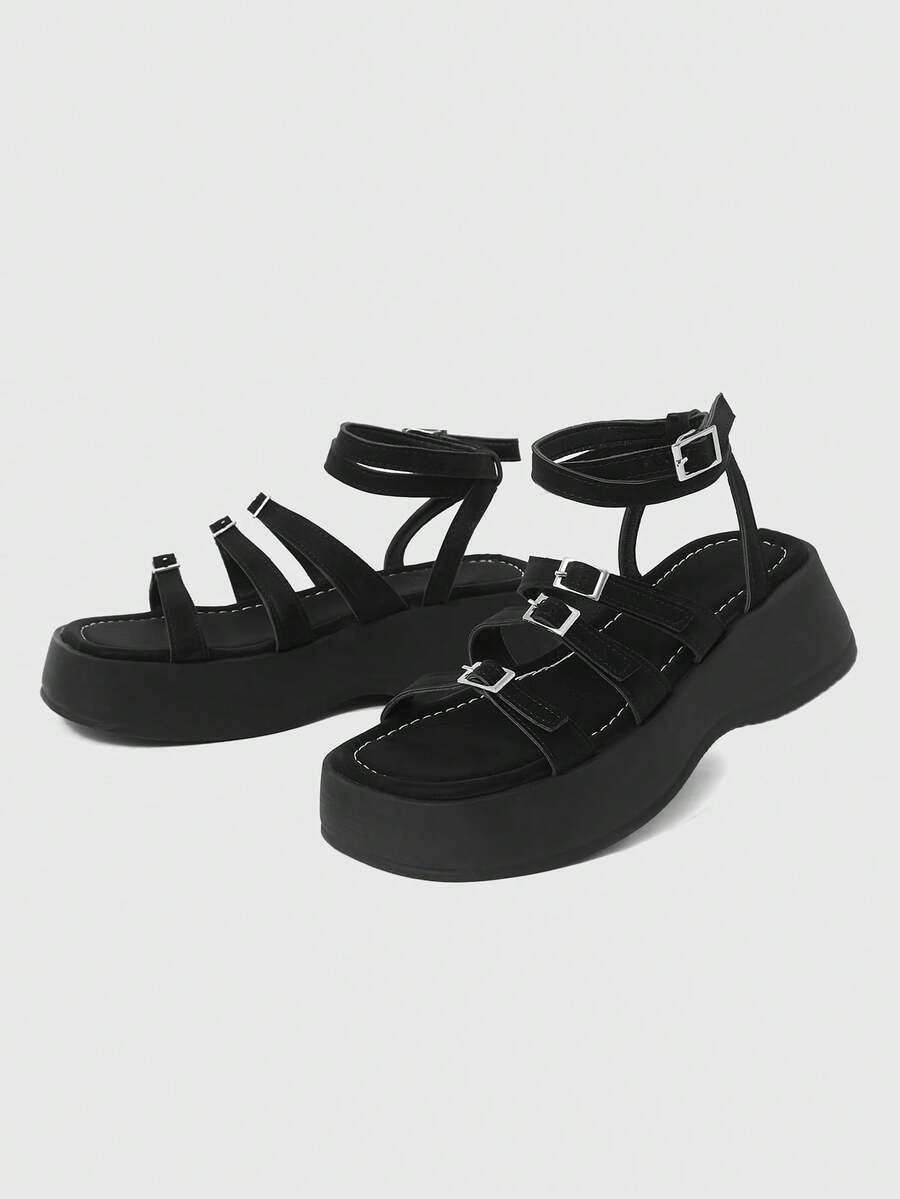 Grunge Punk Women's Dark Summer Open Toe Sandals, Punk Rock Goth Style Criss-Cross Strap Rhinestone Glitter Dress Shoes, Roman Beach Vacation Wedge Platform Heeled Sandals