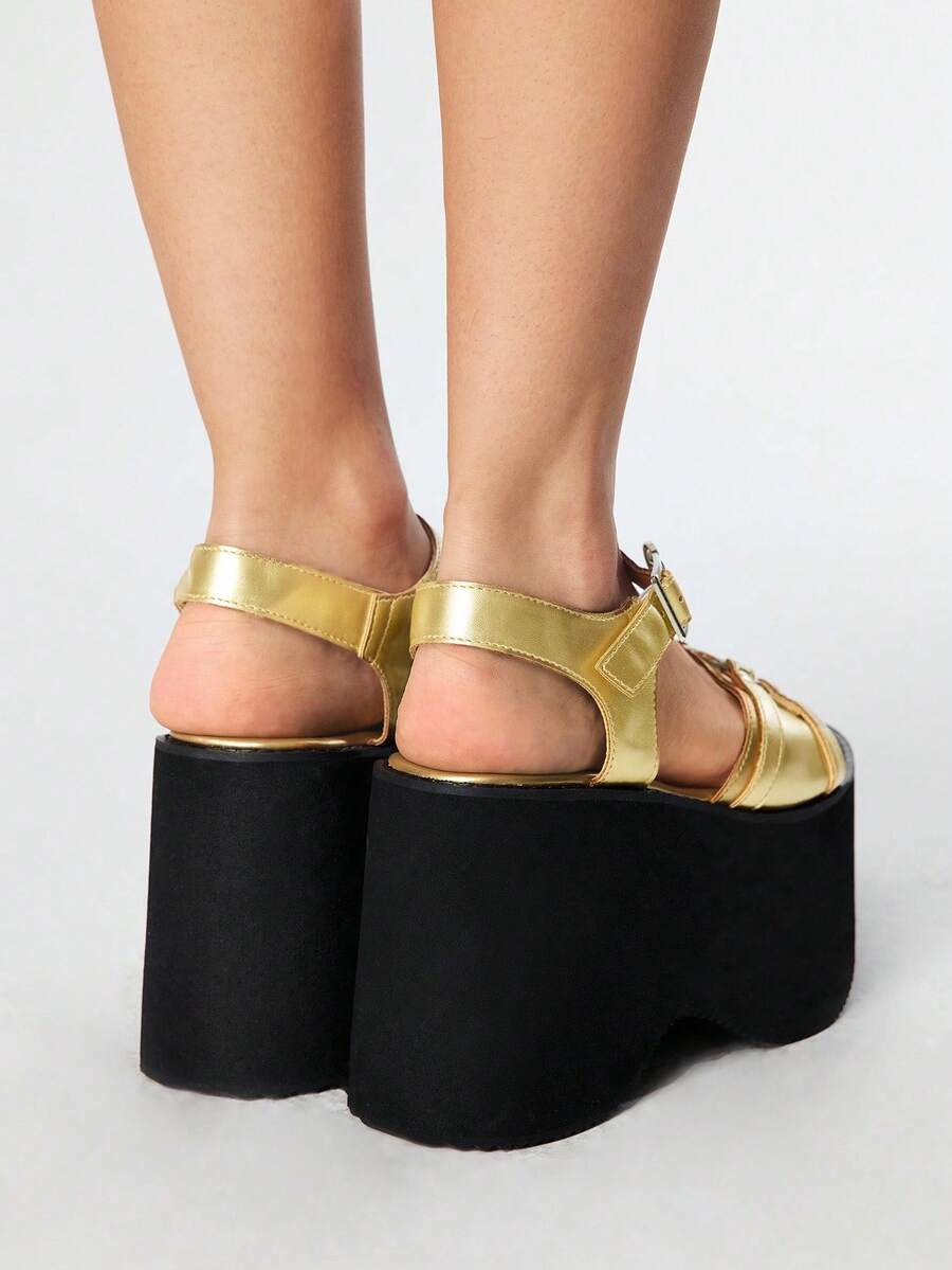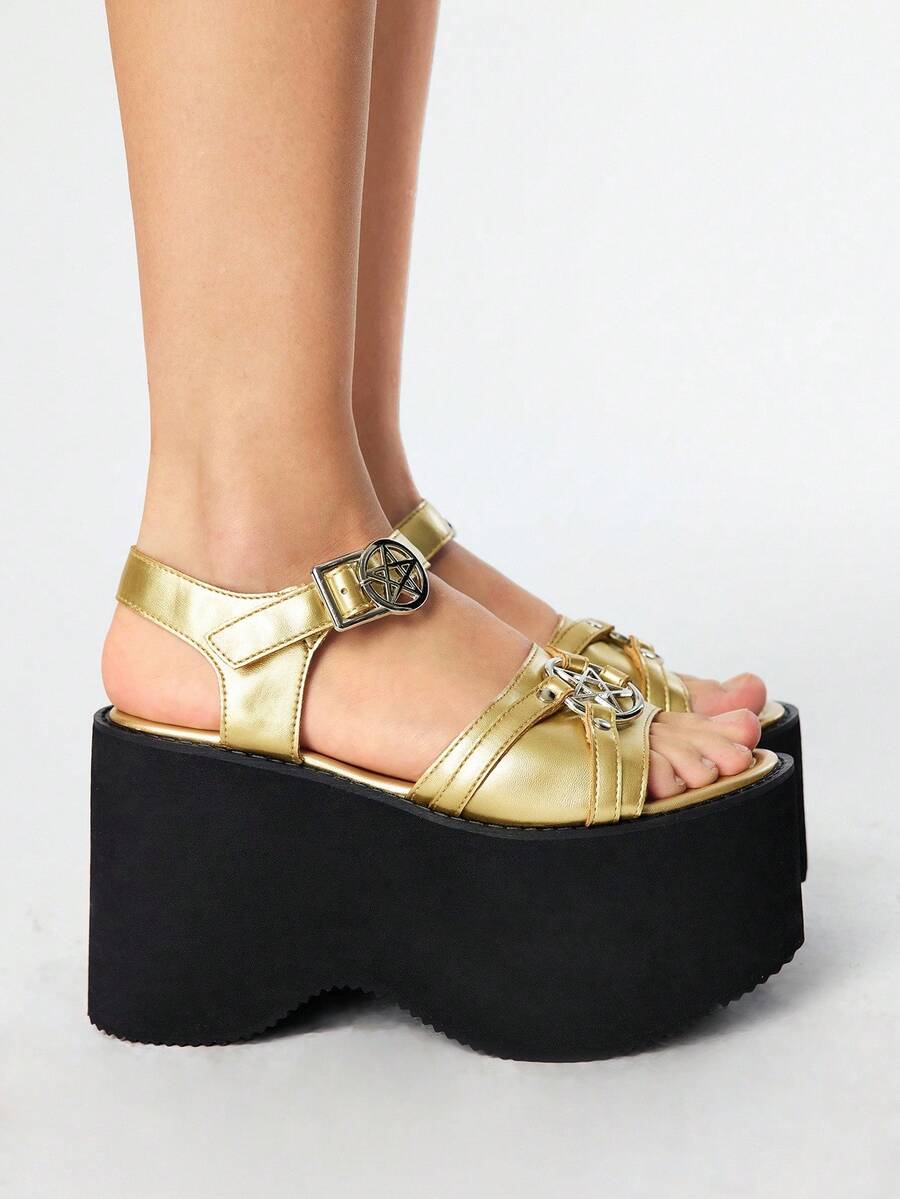 Grunge Punk Women's Gold Super High Heel Thick Bottom Punk Buckle Sandals, Gothic Round Star Rivet Buckle Adjustable Elastic Band, Simple Open Toe Wedge Heeled Shoes