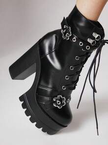 Grunge Punk Women's Gothic Metal Buckle Round Toe Platform Chunky Heel Punk Boots, PU Black High Heel Boots Suitable For Party, Daily Wear, Evening Dress, Height Increase And Leg Elongation