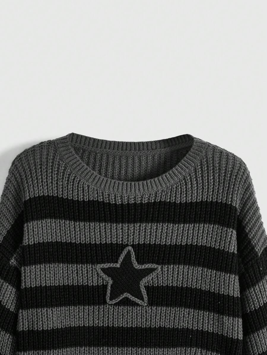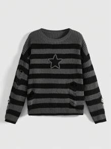 Grunge Punk Women's Star Decoration Striped Round Neck Pullover Sweater