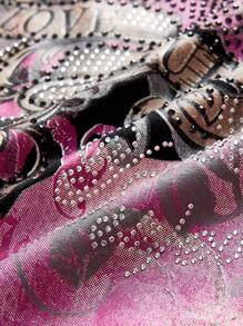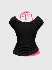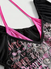 Grunge Punk Women's Vintage Romantic Rose Floral Vine Heart Rhinestone Contrast Halter Tie Bow T-Shirt, Summer