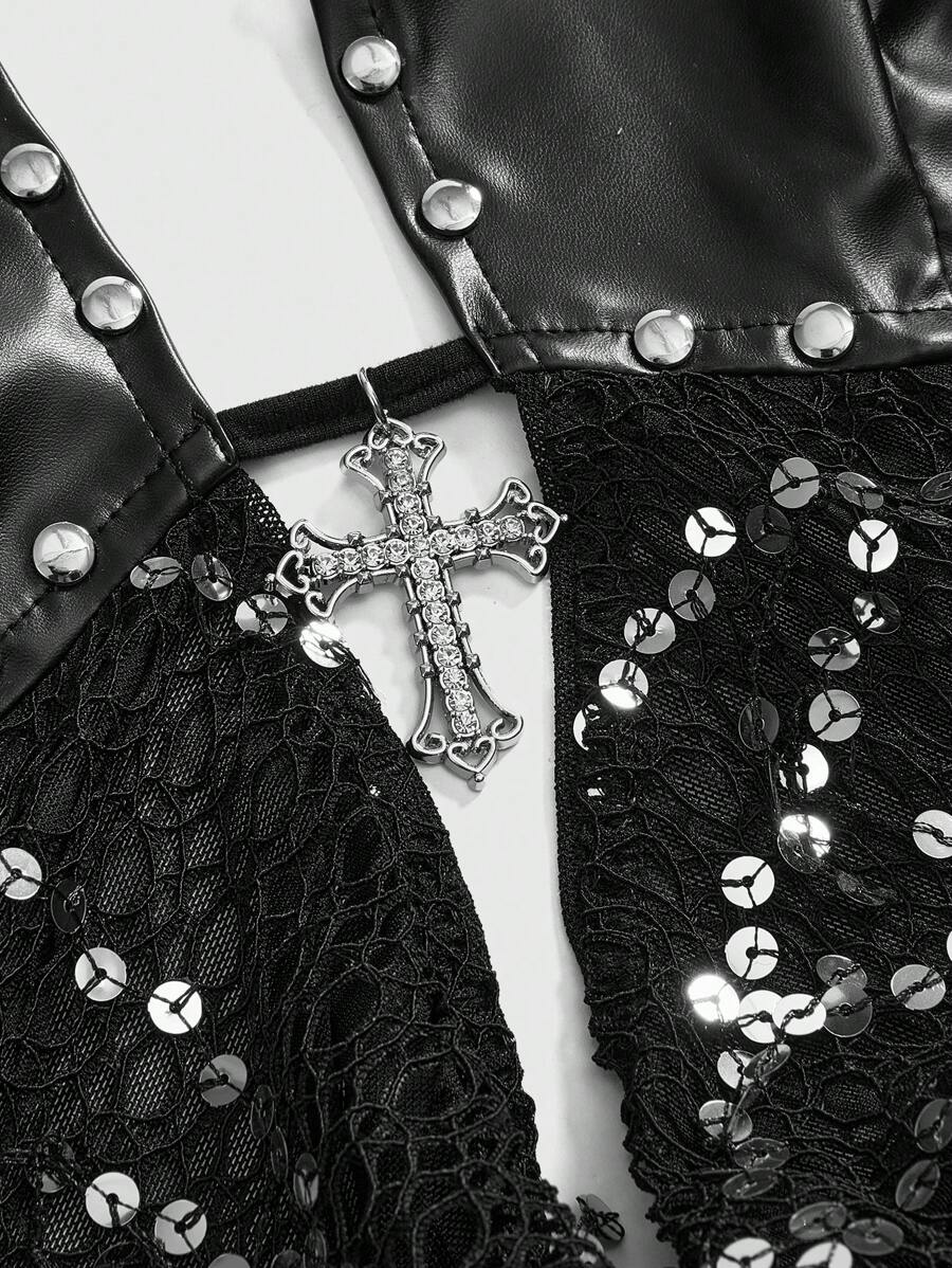 Grunge Punk Women's Y2K Sexy Metal Cross Pendant Mesh Sequins Splice Scoop Neck Backless Tank Top